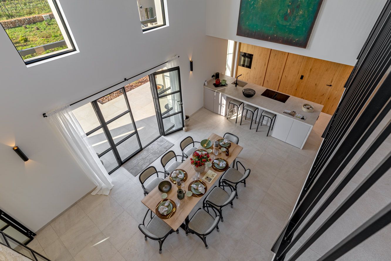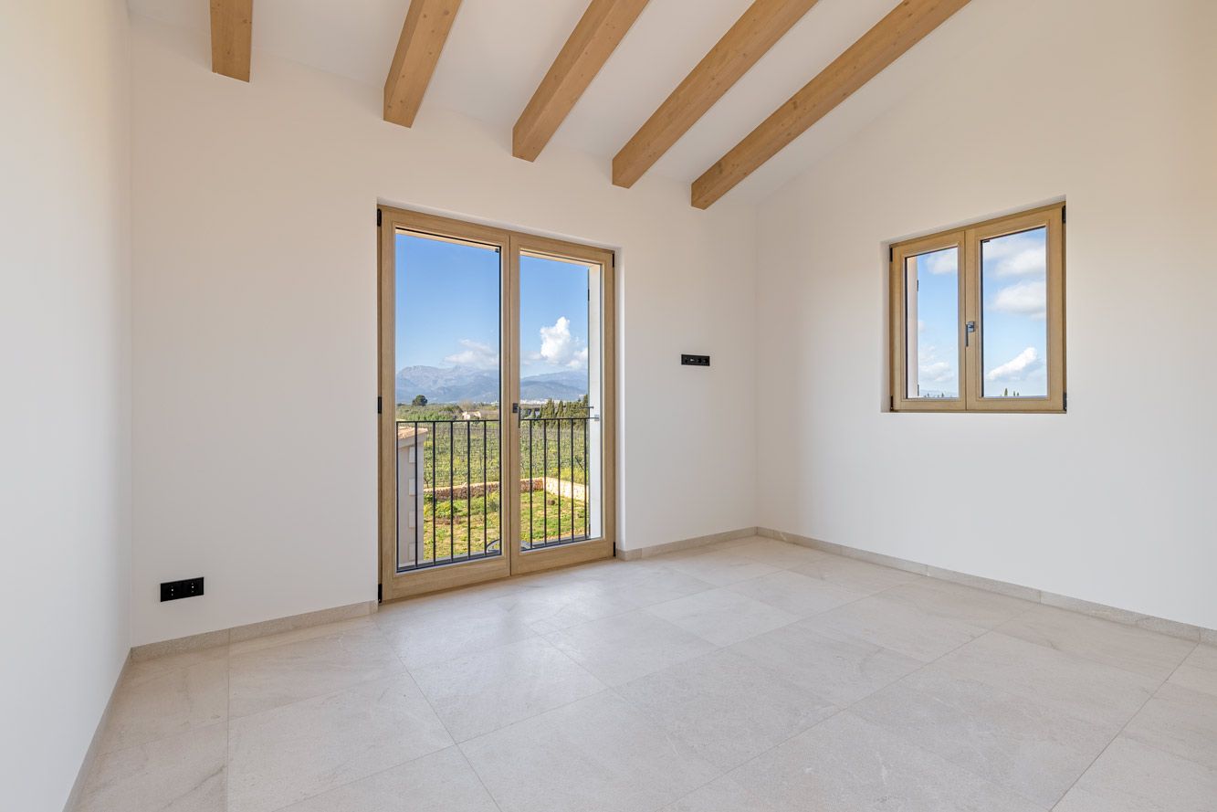 Denna finca är en arkitektonisk juvel som kombinerar modern elegans och mallorkinsk tradition i perfekt harmoni. Inramad av autentiska naturstensmurar och med vidsträckt utsikt över Tramuntana-bergen erbjuder denna fastighet en tidlös tillflyktsort av högsta kvalitet. Husets mittpunkt är det imponerande vardagsrummet, vars öppna planlösning är exceptionellt rymlig tack vare ett galleri och rum med dubbla höjder. Ett särskilt blickfång är den två våningar höga naturstensväggen med integrerad tunneleldstad, som inte bara fyller vardagsrummet utan även köket och matplatsen med mysig värme, medan synliga träbjälkar betonar Medelhavskaraktären.