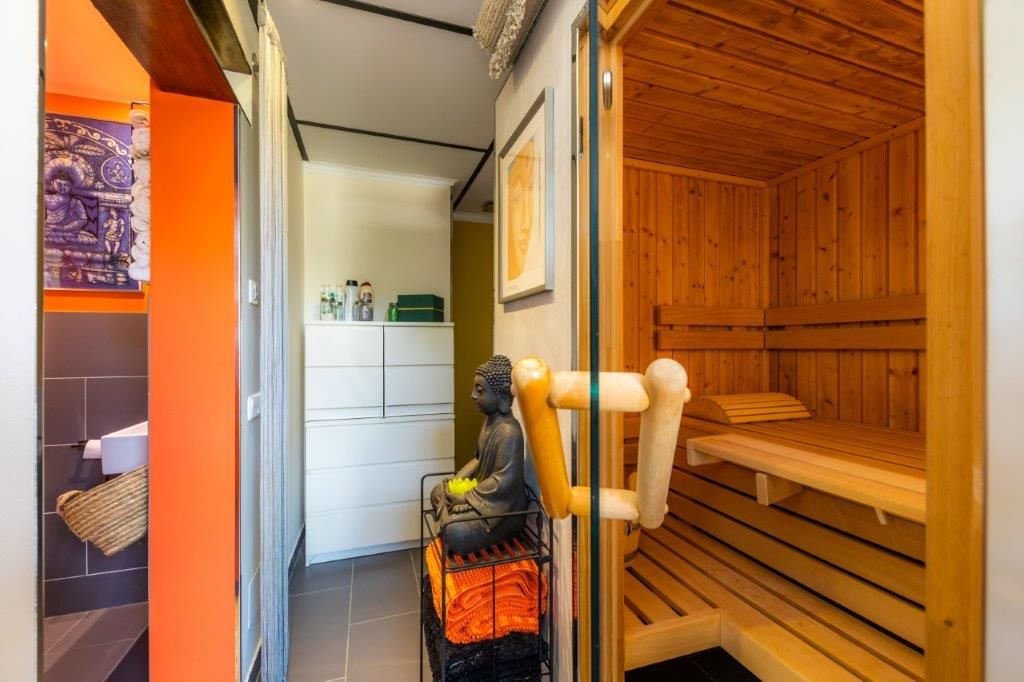 Utomhusområdet är en sann oas: välskötta trädgårdar, täckt veranda med grill, privat pool med solarium, utomhusdusch, toalett, täckt garage och två förråd.