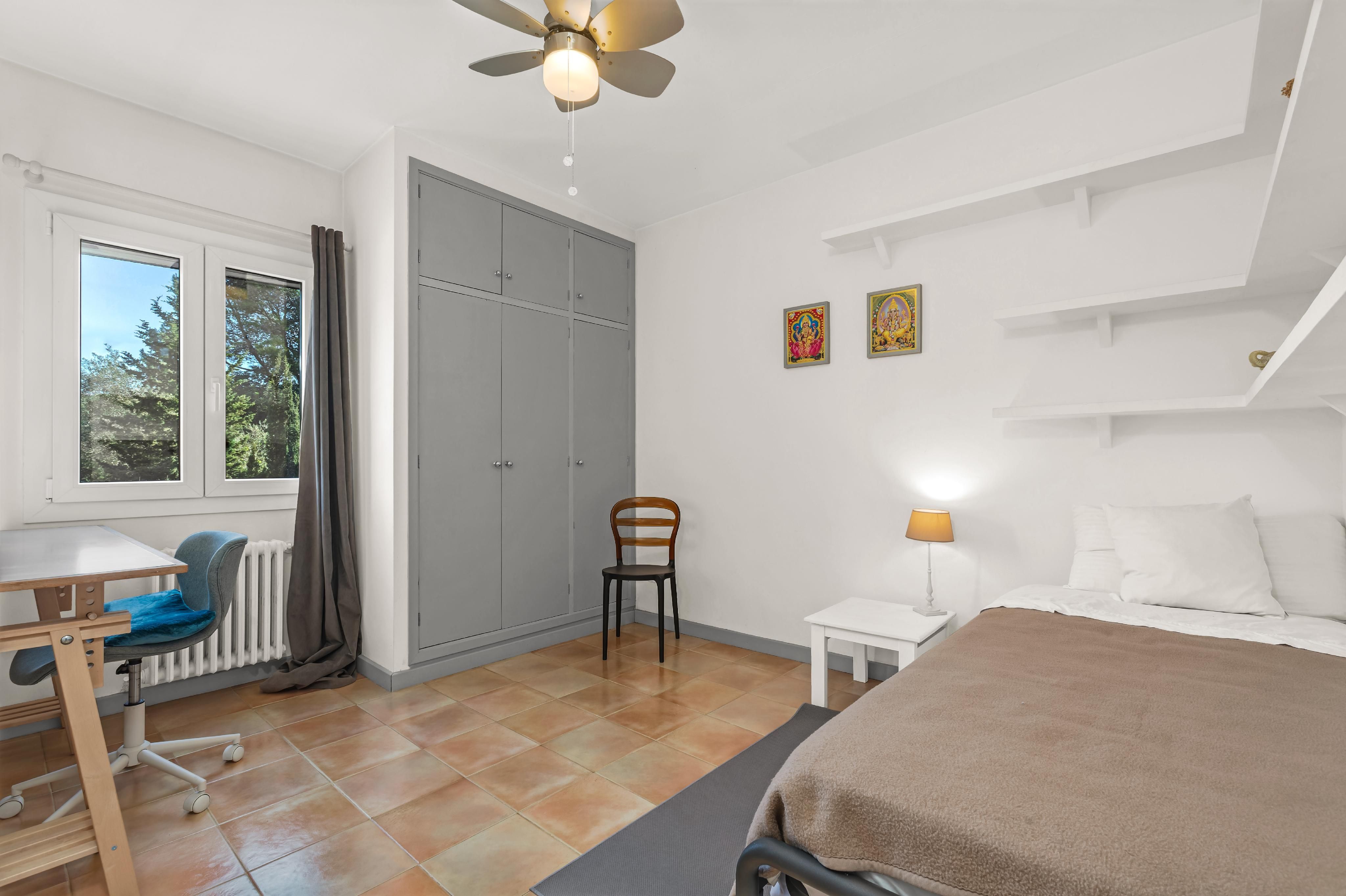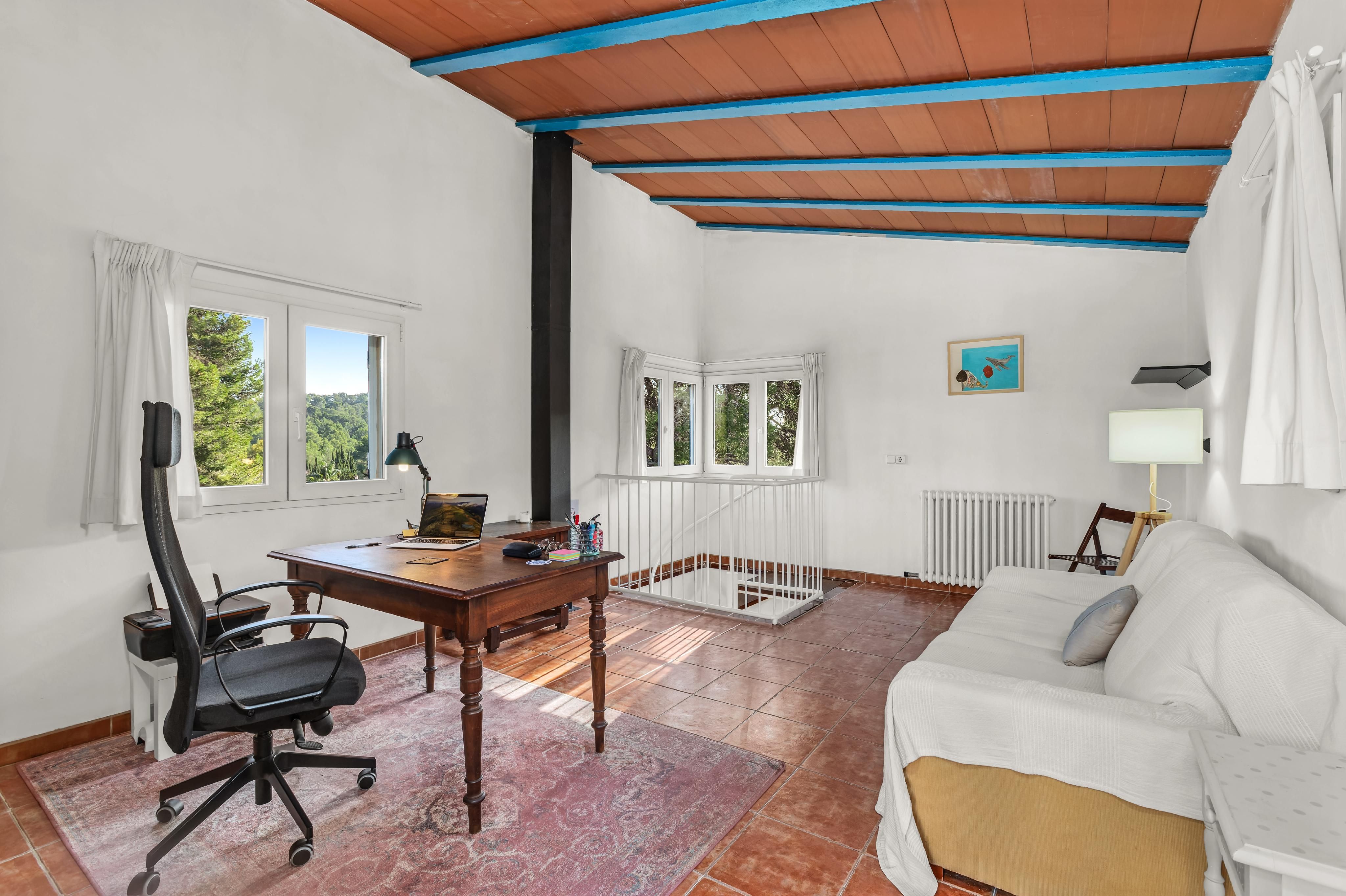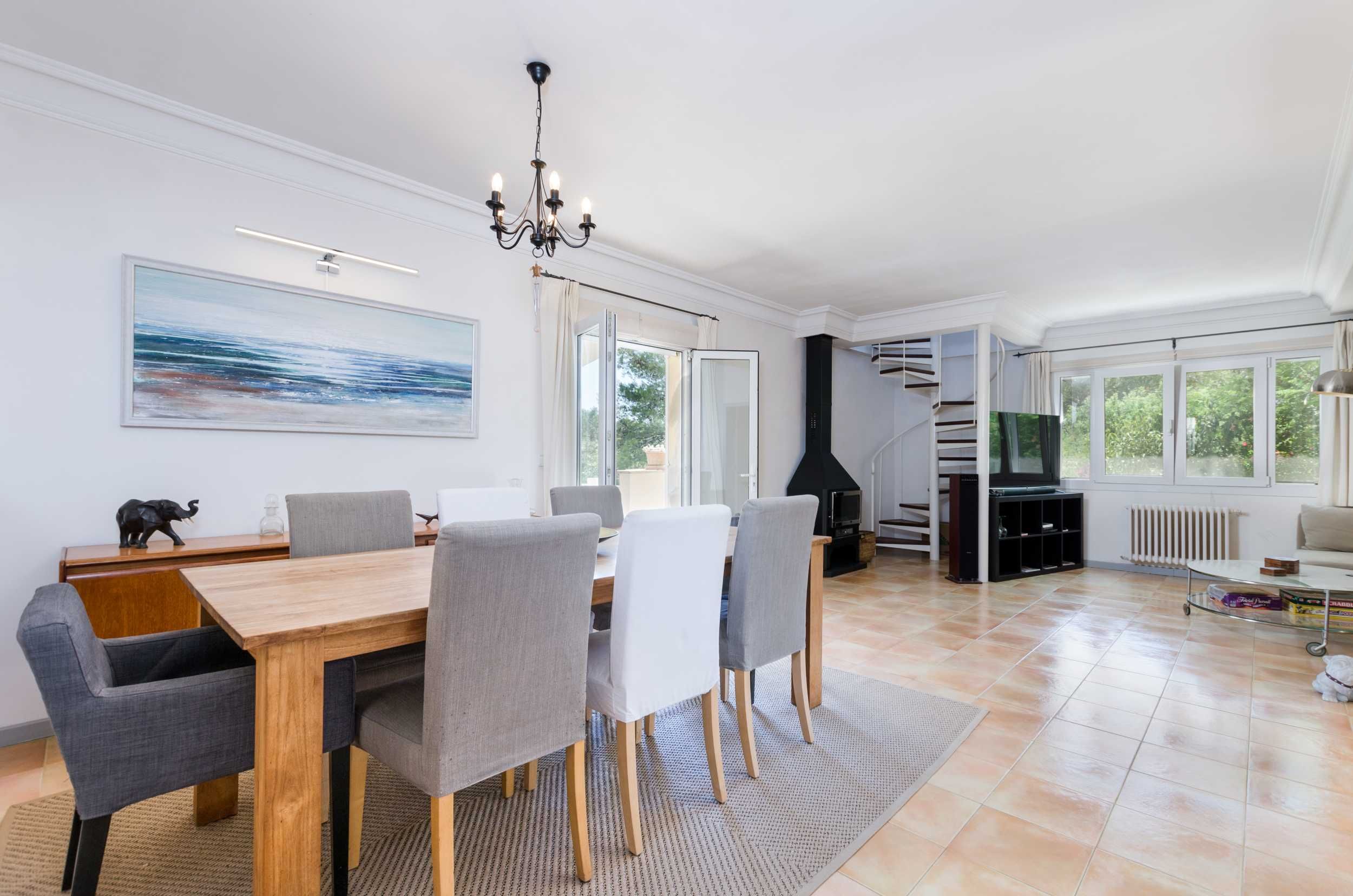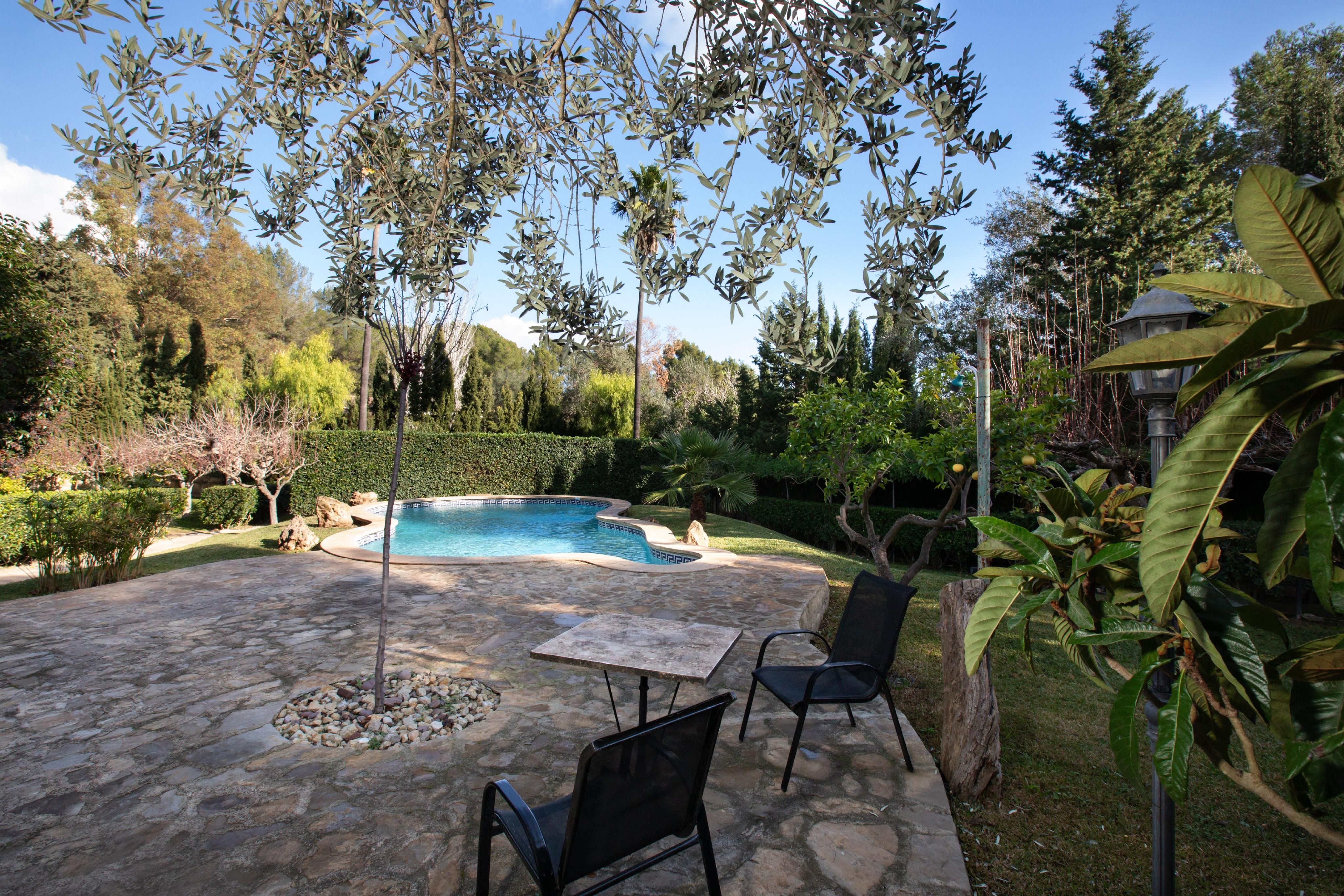 Detta charmiga lanthus ligger på en 2 000 m2 stor tomt i den lugna urbanisationen Ses Rotgetes de Canet. Den privata marken med 35 olika träd, inklusive tolv apelsinträd, tre citronträd, ett fikonträd, ett aprikosträd, mandelträd och olivträd, är en drömreträtt för naturälskare, cyklister, vandrare och naturligtvis barnfamiljer. Terrasserna, den täckta utomhusgrillen och poolen med en bra storlek på 42 m2 och ett djup på 1,10 till 2,20 meter avrundar perfekt det höga rekreationsvärdet för denna fastighet. Palma kan lätt nås på 15 minuter. Esporlas ligger fem minuters bilresa bort. Här hittar du alla butiker för dagliga behov, kaféer, restauranger, bodegor, boutiquer och hotell. Huset erbjuder ett rymligt vardagsrum med matsal på bottenvåningen med tillgång till den soliga terrassen med utsikt över trädgården. Här finns också köket, tre sovrum, varav ett med eget badrum, samt ytterligare ett badrum. På övervåningen finns ytterligare ett rum som kan användas som sovrum eller arbetsrum. Den angränsande takterrassen har en extern trappa så att en separat gästsvit också kan skapas här. Källaren i huset har plats för en eller två bilar. Förutom olika förvaringsrum finns det också en vinkällare och ett badrum med dusch. Centralvärmen med olja och den vedeldade kaminen i vardagsrummet ger mysig värme i hela huset under kallare dagar.