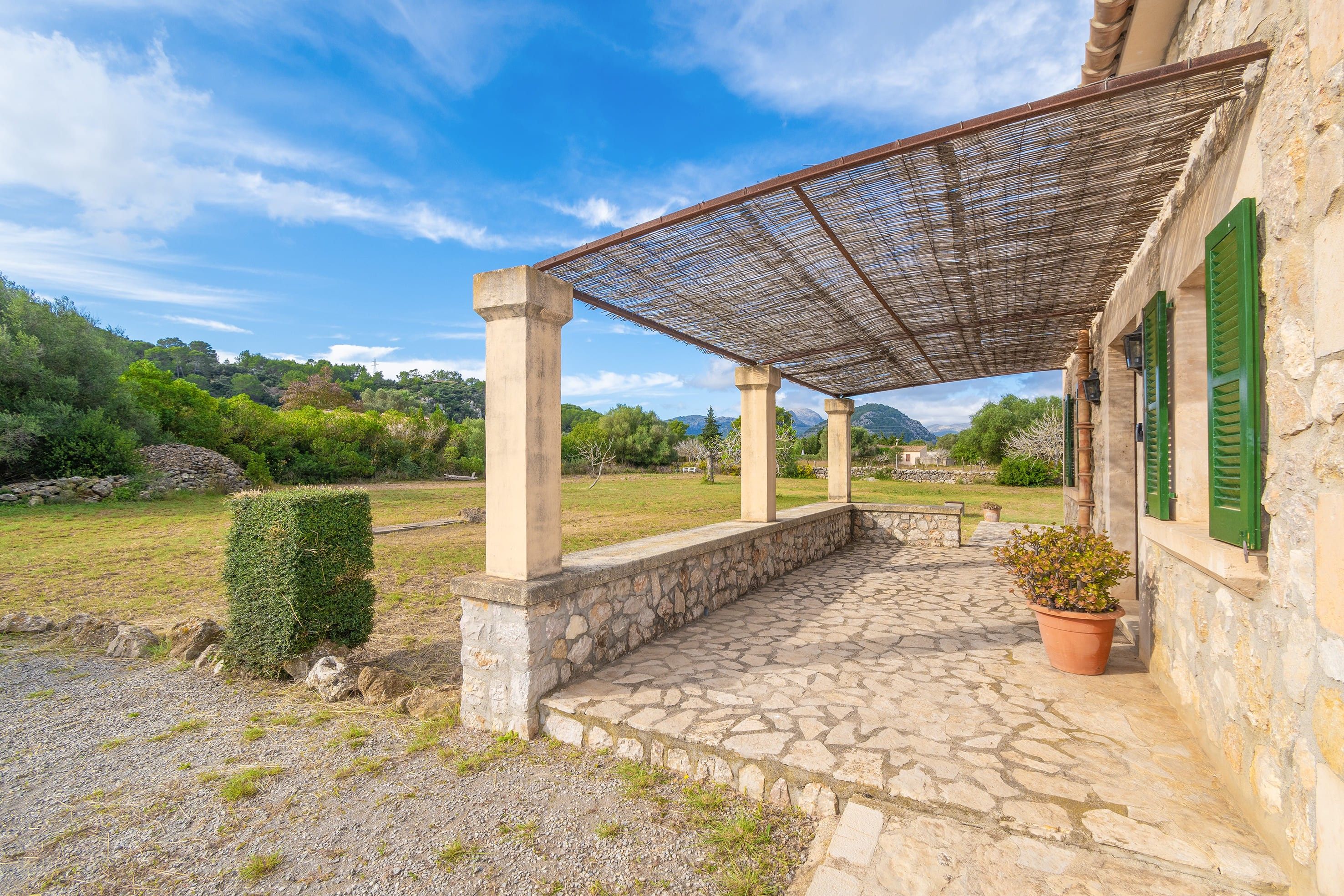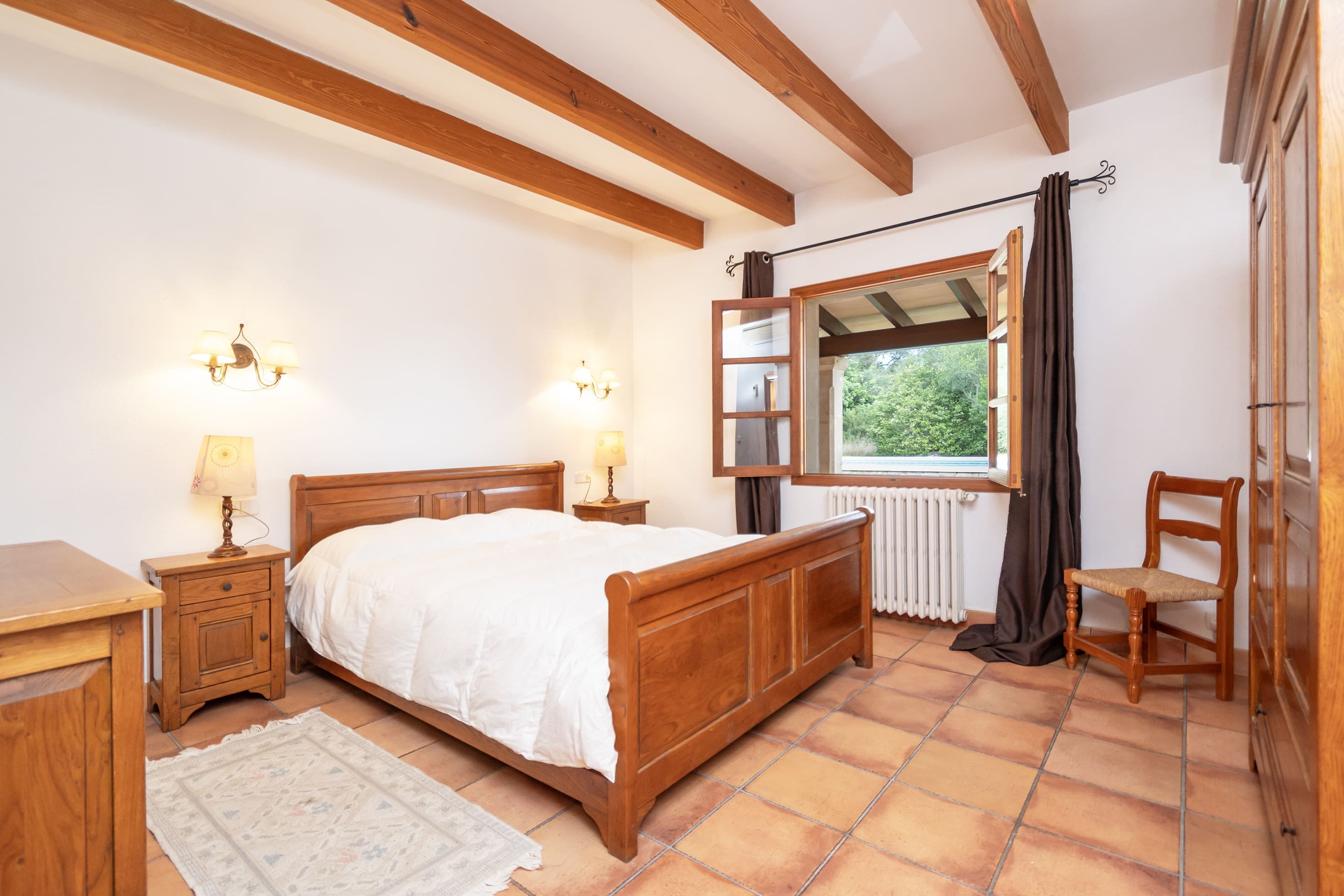 Fastigheten är fördelad på en våning och ligger i ett lugnt landsbygdsområde nära Pollensa golfbana. Interiören erbjuder en ljus och välkomnande atmosfär med en entréhall, ett sovrum med dubbelsäng och ett sovrum med två enkelsängar, båda med utsikt över poolområdet. Ytterligare ett sovrum med två enkelsängar erbjuder fantastisk utsikt över de majestätiska Tramuntana-bergen. De tre sovrummen delar på två separata badrum. Dessutom har fastigheten ett fullt utrustat kök med matplats och ett vardagsrum med matsal i öppen planlösning med direkt tillgång till terrassen och poolområdet.