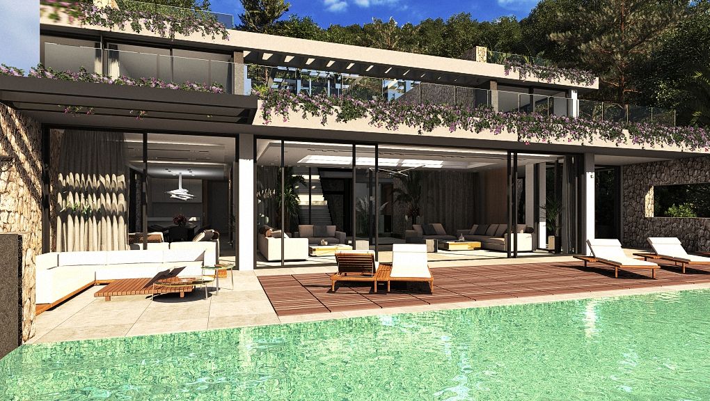 Denna exceptionella villa byggs på solsidan av Canyamel, en lugn kuststad nära Capdepera. Fastigheten med 547 m² boyta kommer att sträcka sig på en sluttningstomt över fyra nivåer. På gatunivå finns entrén med tre parkeringsplatser, trappa och hiss. I den första källaren finns två sovrum med eget badrum, omklädningsrum och tillgång till en terrass med havsutsikt. I den andra källaren finns vardagsrum och matplats med öppet kök. Härifrån har du tillgång till terrassen med infinitypool och utsikt över Canyamelbukten. På denna nivå finns ytterligare ett sovrum med badrum en suite. På husets nedre plan finns en studio, hobbyrum, hemmabio, bodega, teknikrum och ett sovrum med badrum en suite samt ytterligare en terrass med liten pool. Alla nivåer är byggda runt en stor uteplats. Glasfronter ger utsikt över den exotiska vegetationen på uteplatsen och ger en unik boendeupplevelse. Den högkvalitativa inredningen inkluderar golvvärme, central luftkonditionering, marmor och parkettgolv. Tvåskaligt murverk och solskydd säkerställer ett perfekt rumsklimat. Byggandet kommer att starta efter avtalsavtalet med förvärvaren, därför kan individuella önskemål beaktas. Badmöjligheter i havet ligger inom gångavstånd. Det finns också flera restauranger i omedelbar närhet. Det ädla 5-stjärniga Cap Vermell Grand Hotel ligger bara två minuter bort. Countryklubben som ligger där erbjuder ett brett utbud av sport- och fritidsaktiviteter. Inom en radie på bara några kilometer finns fyra golfbanor, flera småbåtshamnar och de små städerna Artá och Capdepera med många shopping- och nattlivsmöjligheter.
