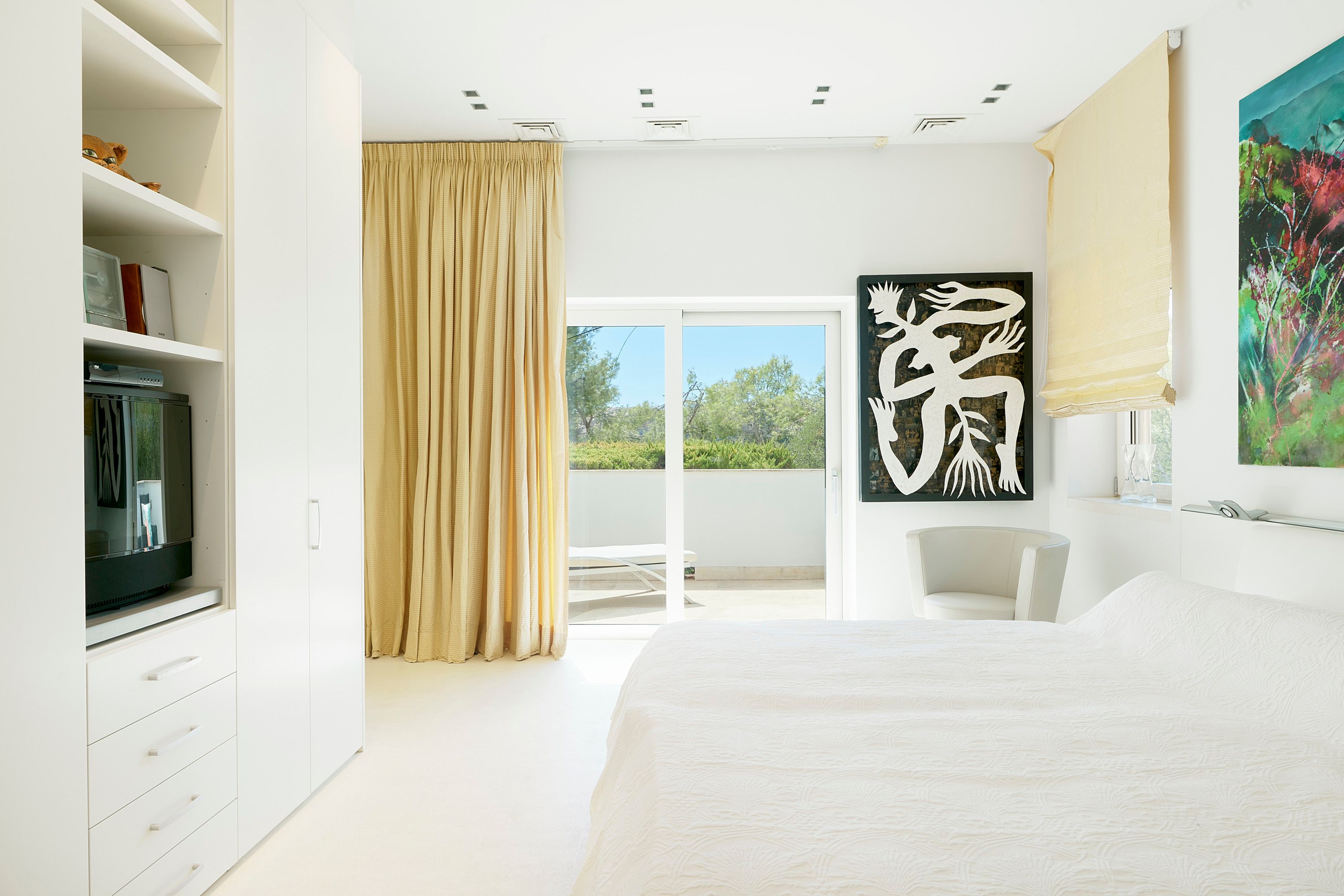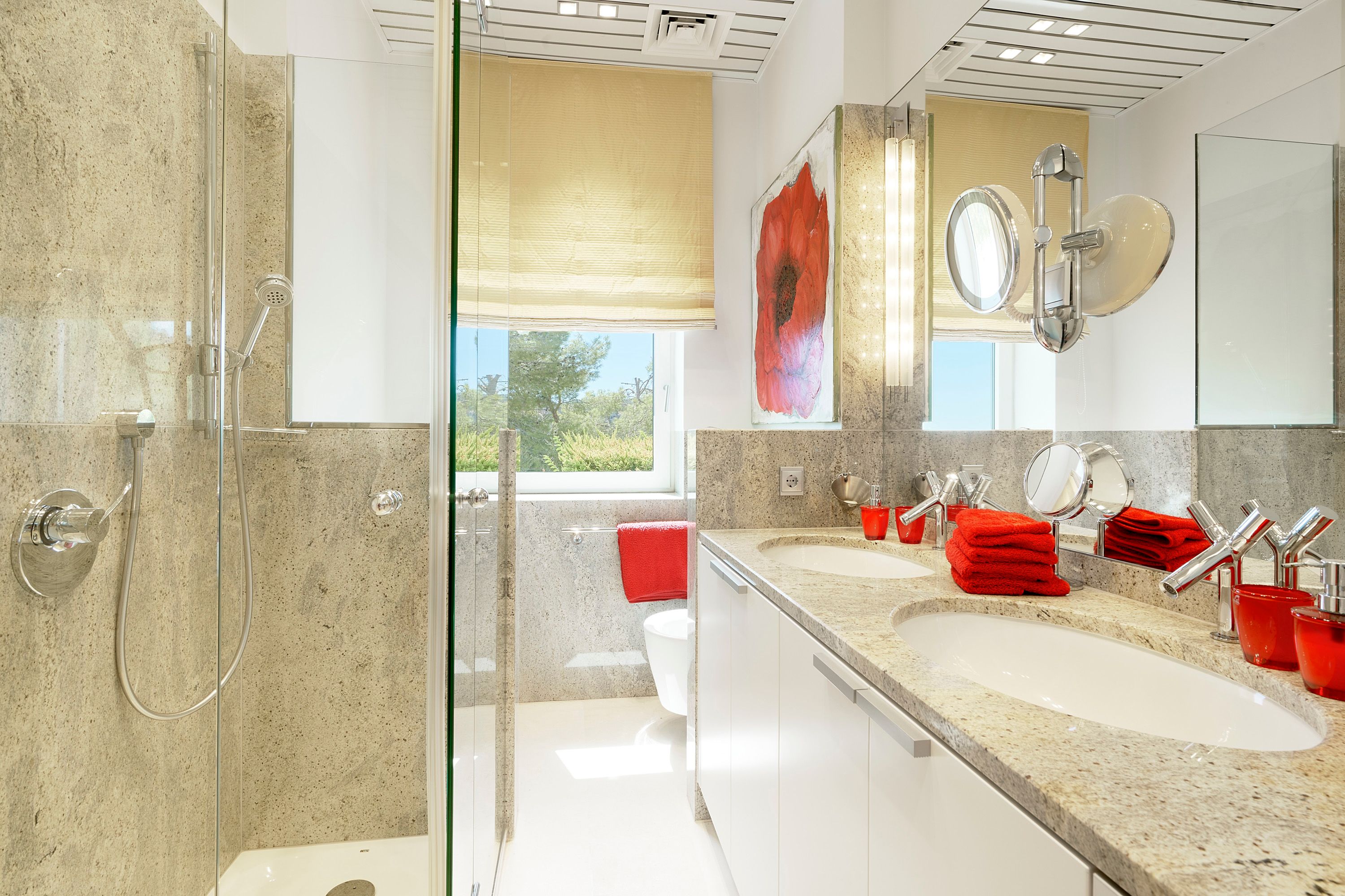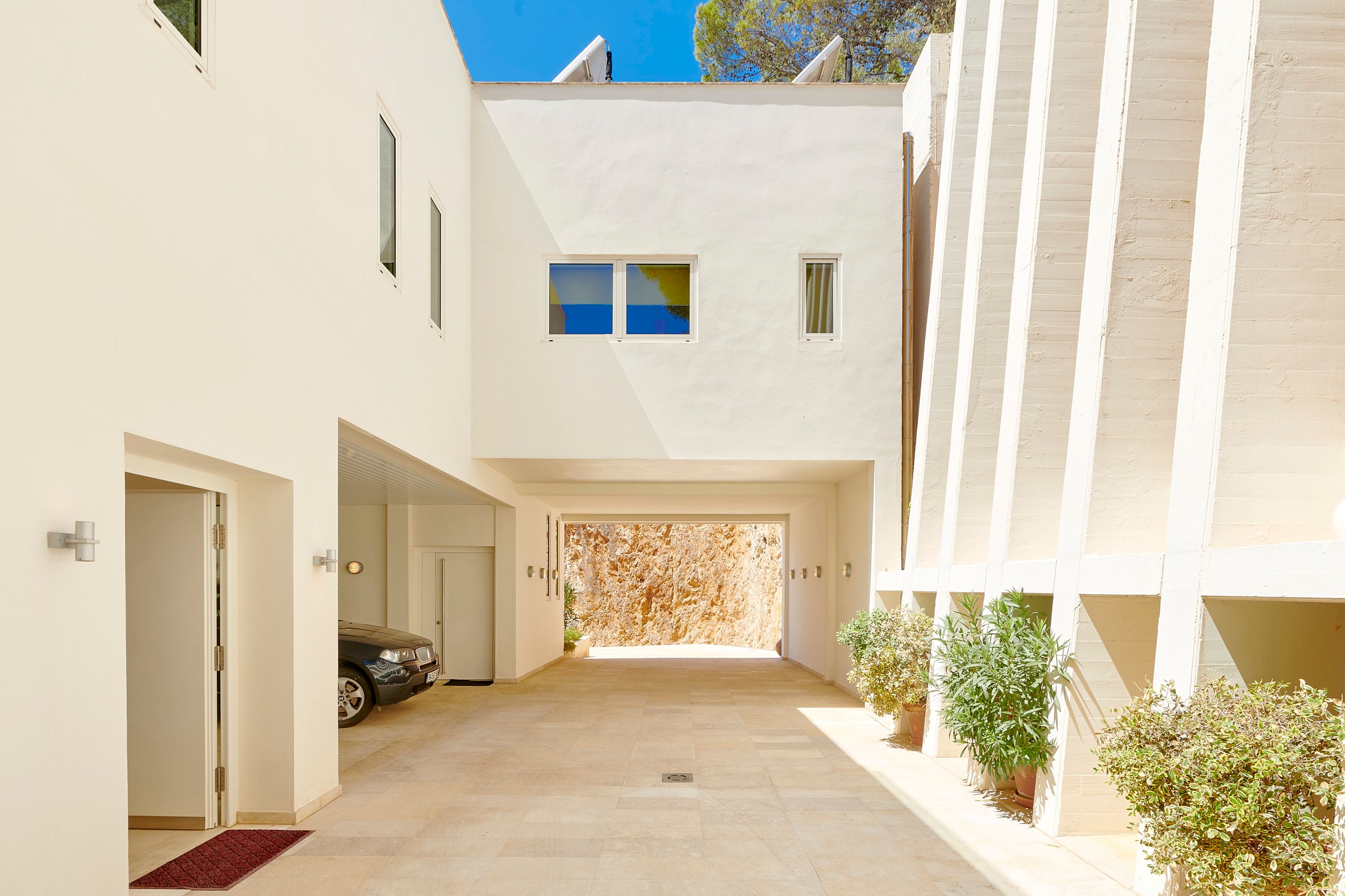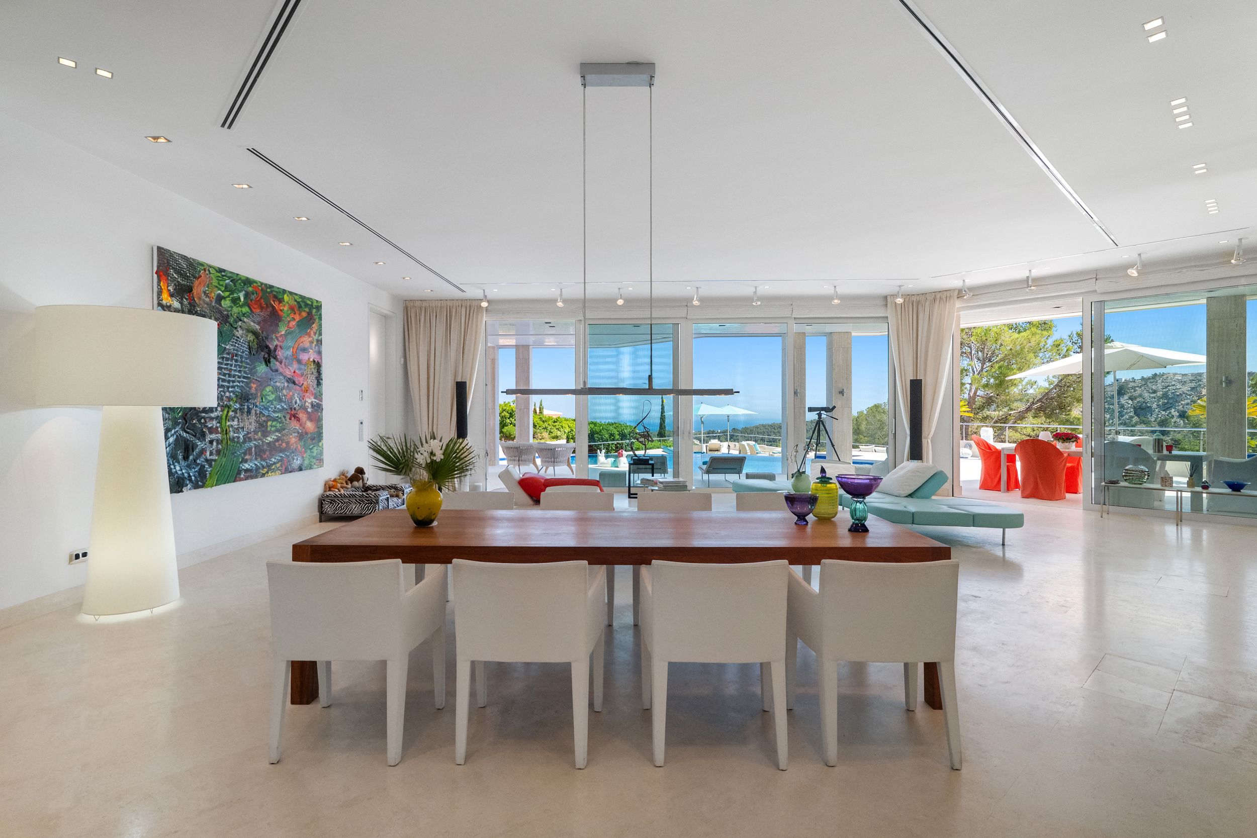 Denna exklusiva fastighet ligger i Son Vida och har inte bara verkligt unika designelement utan också fantastisk havsutsikt över Palmas bukt och staden. Bostadsytan på 750 m2 och de olika terrasserna är fördelade på tre våningar. På bottenvåningen finns en imponerande entréhall med dubbel takhöjd. På denna nivå finns en gäst- eller självständig personallägenhet med ett sovrum och eget badrum, kök och vardagsrum. Det finns också ett separat mediarum eller hemmakontor och en gästtoalett. På första våningen finns det stora vardagsrummet och matplatsen med tillgång till den rymliga 220 m2 stora poolterrassen och den 80 m2 stora saltvattenpoolen. Det separata köket har moderna vitvaror och direkt hiss till den enorma takterrassen på 330 m2 med ett utekök och spektakulär utsikt över havet. Förutom master-sviten med eget badrum och stort omklädningsrum har fastigheten också ytterligare tre gästsovrum med eget badrum på samma våning. Det finns också ett bibliotek / TV-rum med tillgång till poolterrassen. Ytterligare funktioner: solpaneler, naturstengolv, Bulthaup köksapparater, hiss på alla våningar, täckt parkering för två stora bilar och ett tekniskt rum.