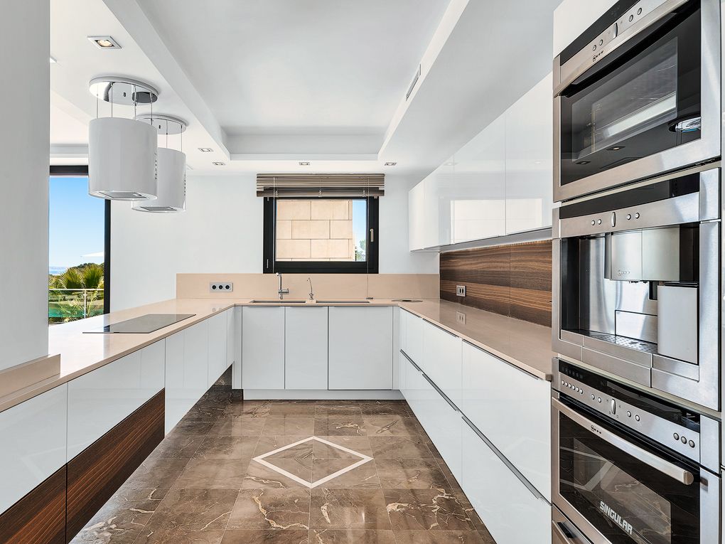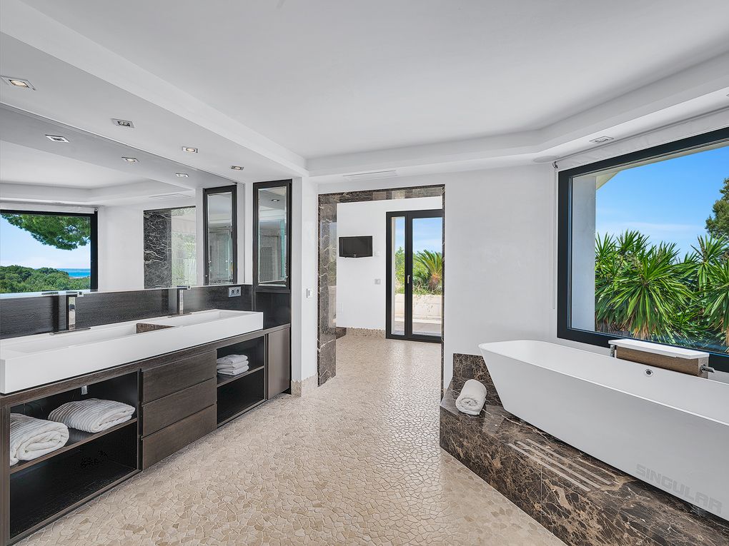 Belägen i ett av de mest prestigefyllda och eftertraktade bostadsområdena på sydvästra Mallorca, i Bendinat, har denna fastighet - av högsta kvalitet och fullt möblerad - fantastisk panoramautsikt över havet. Boytan är fördelad på två våningar. På bottenvåningen finns vardagsrummet och matsalen med kök i öppen planlösning och fantastisk havsutsikt. Den vackra uteplatsen/gården har en avslappnad atmosfär som skapas av fontänen, belysningen och växterna och som ytterligare förstärks av den mysiga värmen från den öppna spisen. Det stora matbordet i marmor för 12 personer är den perfekta platsen för att njuta av kvalitetstid med familj och vänner. Från den ljusa uteplatsen har gästerna tillgång till sovrummen och lägenheterna. Översta våningen är reserverad enbart för det mycket privata master bedroom med ett magnifikt badrum, som också innehåller en bastu och andra bekvämligheter. Andra funktioner inkluderar golvvärme, eldstäder, elektriska dörrar och fönsterluckor, bakgrundsmusik, säkerhetskameror, hiss, vinkällare, en lounge, garage och den magnifika infinitypoolen. Pool- och trädgårdsunderhåll ingår.