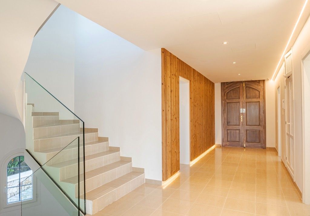 Denna eleganta villa ligger i den eftertraktade urbanisationen Sa Punta i Portocolom, bara 300 meter från den naturliga stranden S'Arenal. Fastigheten byggdes 2003 och totalrenoverades 2021/22. Den erbjuder en framgångsrik kombination av modern design och högkvalitativa material. Villan är fördelad på tre våningar. På bottenvåningen finns ett ljust vardagsrum och matplats med utsikt över hamnen i Portocolom, ett fullt utrustat kök, en gästtoalett och en gästflygel med två sovrum, ett kontor och ett badrum. Det stora fönstret på framsidan ger tillgång till den välskötta trädgården med en rymlig 50 m² saltvattenpool och en täckt terrass. På övervåningen, som nås via en modern trappa, finns en bastu med relaxrum och fantastisk utsikt över hamnen och bergen, samt tre sovrum, två badrum och ett separat badrum. Golvvärme, den öppna spisen i vardagsrummet och central luftkonditionering i alla rum garanterar ett behagligt boendeklimat året runt. Ett garage i källaren, med plats för tre fordon och direkt tillgång till huset, avrundar detta exklusiva erbjudande.