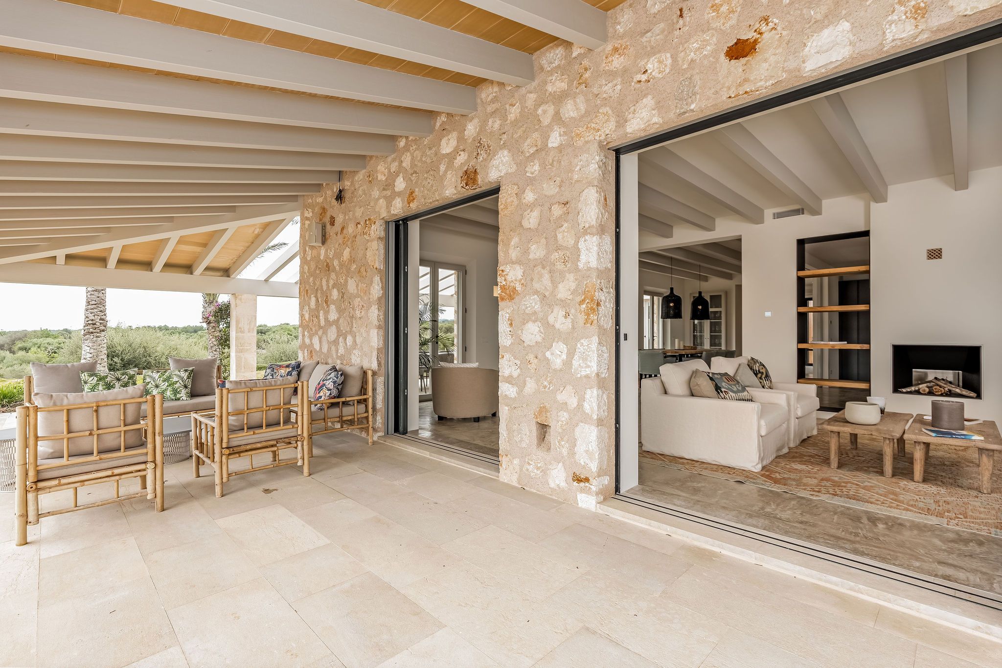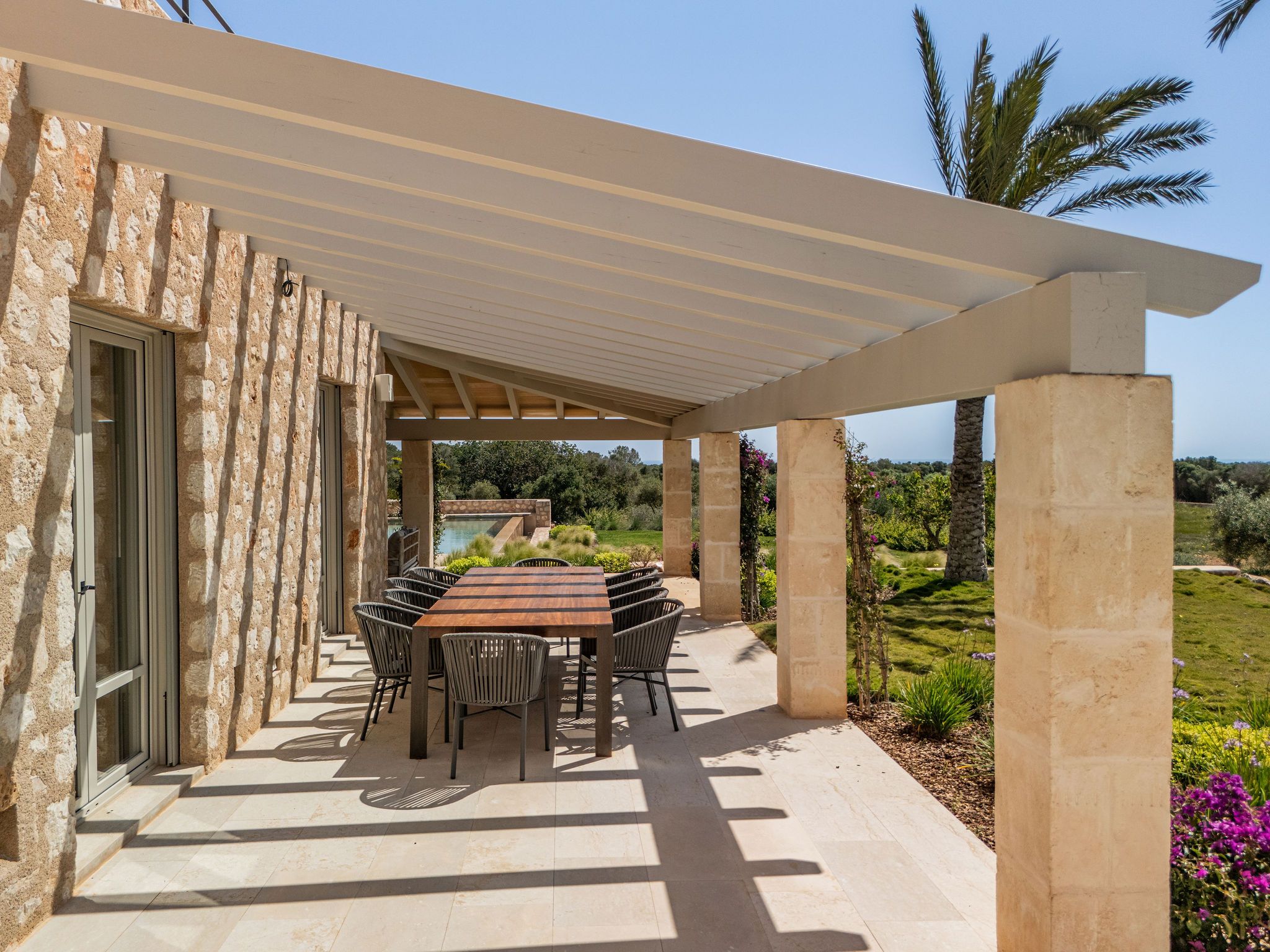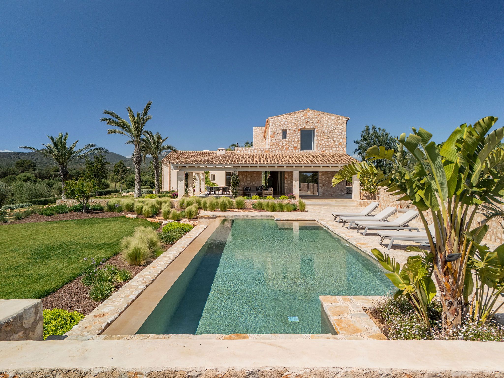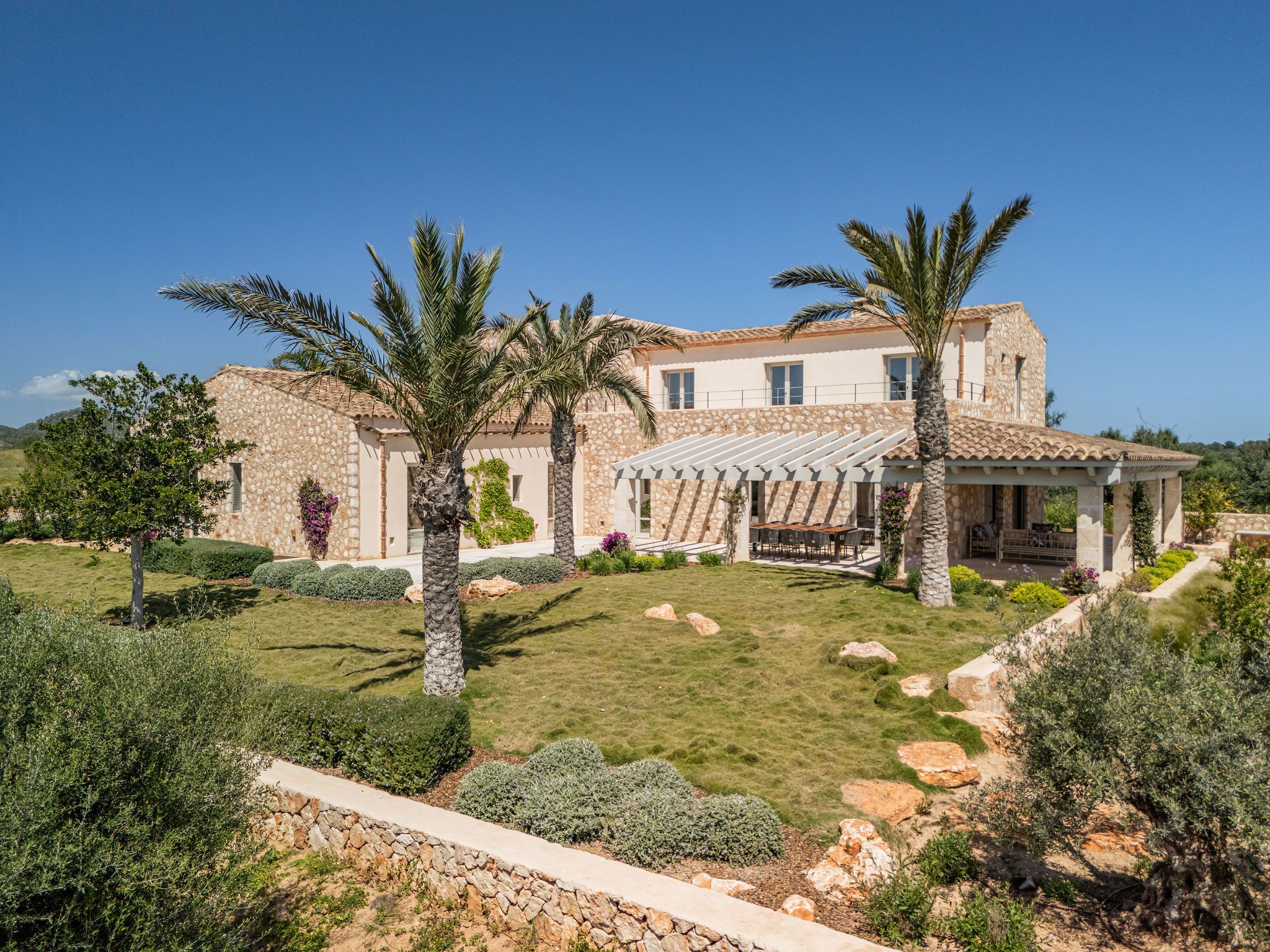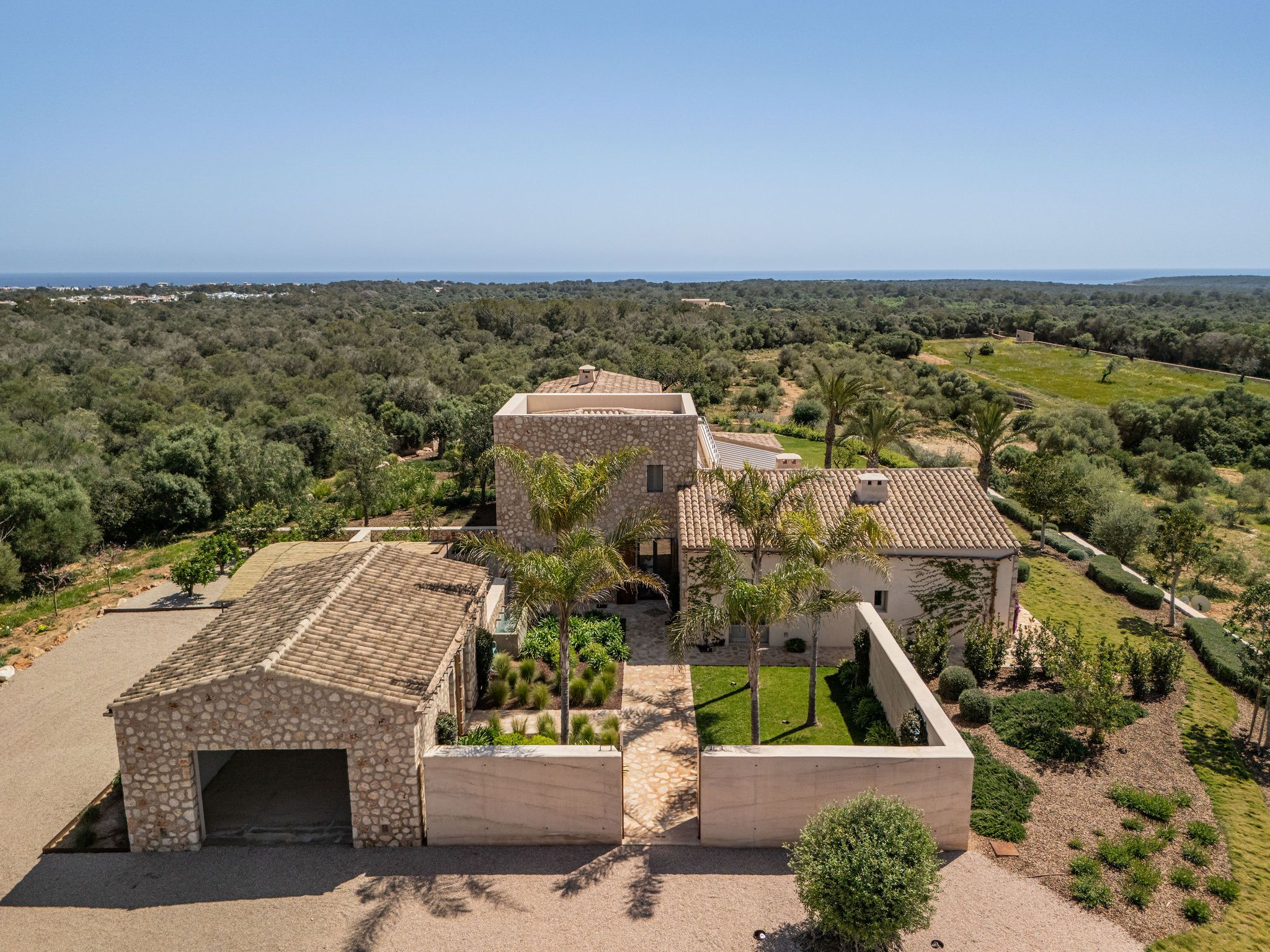 Denna eleganta finca i natursten ligger på en 6 hektar stor tomt mellan Portocolom och Cala Murada och erbjuder spektakulär utsikt över havet. Den yttre designen motsvarar den typiska mallorkinska stilen, medan interiören erbjuder ljusa rum med modern design. Naturliga element som trä och natursten smälter samman med harmonisk arkitektur med material av högsta kvalitet. Bottenvåningen imponerar med ett rymligt vardagsrum / matplats med designad öppen spis och ett angränsande, fullt utrustat kök med öppen planlösning. Härifrån kommer man ut på den täckta verandan. På bottenvåningen finns också fyra sovrum, vart och ett med eget badrum och en gästtoalett. På övre våningen ligger det stora sovrummet med eget badrum och omklädningsrum. Alla rum är luftkonditionerade och golvvärme garanterar ett behagligt inomhusklimat även under svalare dagar. Du kan tillbringa trevliga timmar med familj och vänner i trädgården som kräver lite underhåll. Här finns en pool på ca 60 m² med en mysig lounge och en veranda med en grillplats. Ett garage på ca 50 m² erbjuder plats för två bilar och har en toalett. Andra funktioner inkluderar ett larmsystem, ett smart hemsystem, ett automatiskt bevattningssystem, en brunn och anslutning till det kommunala elnätet.
