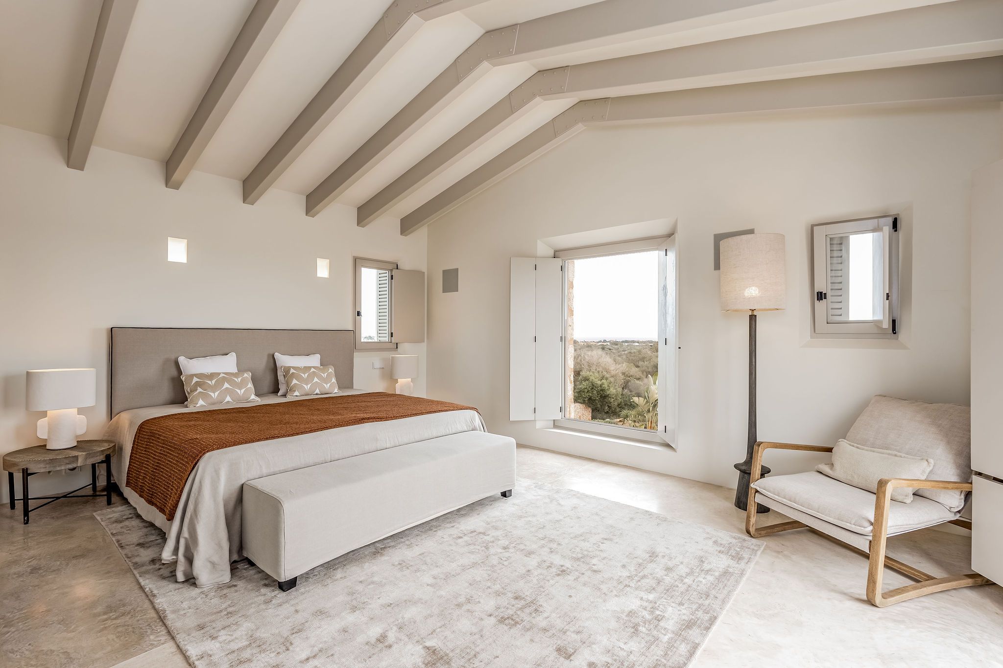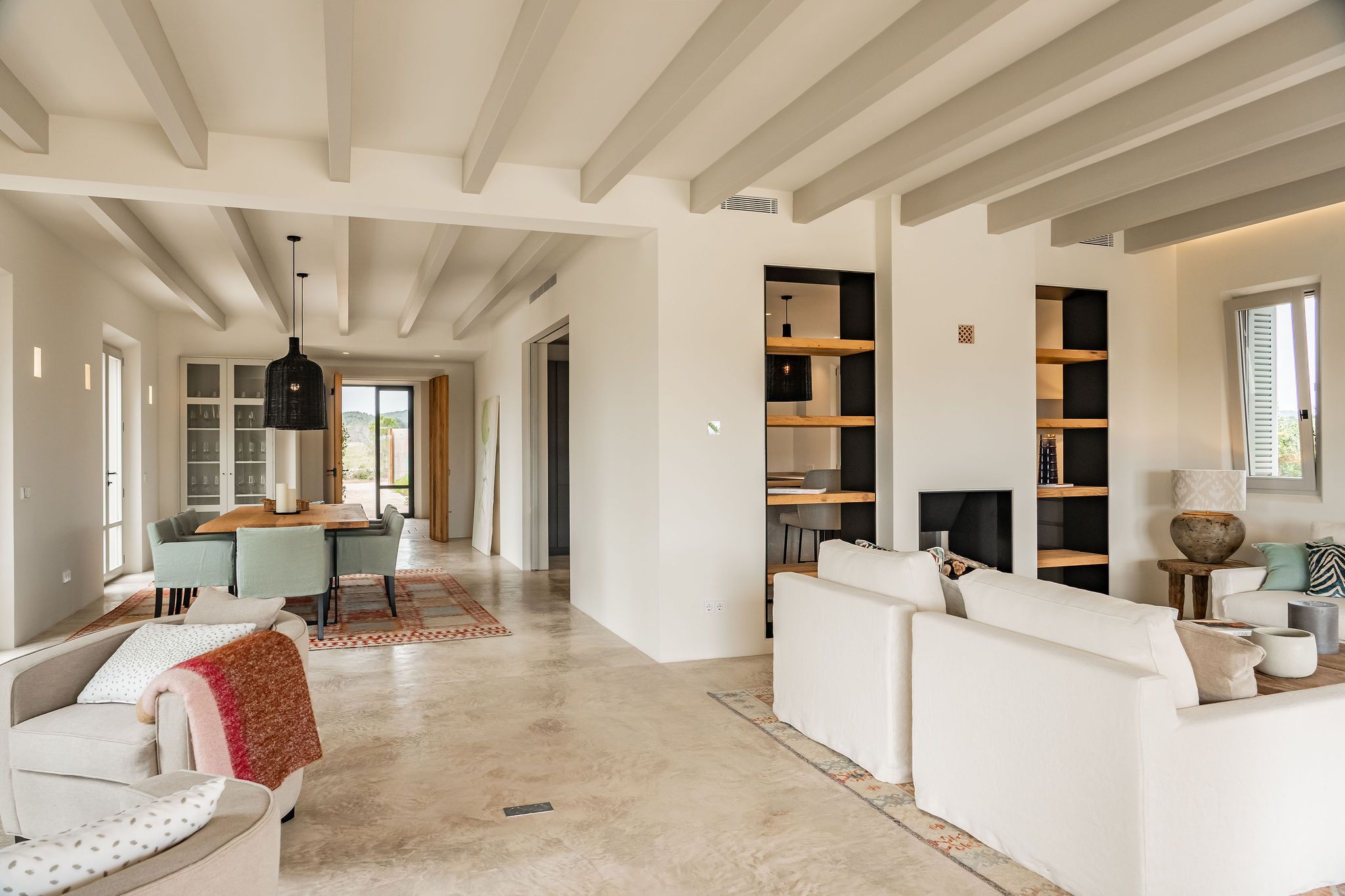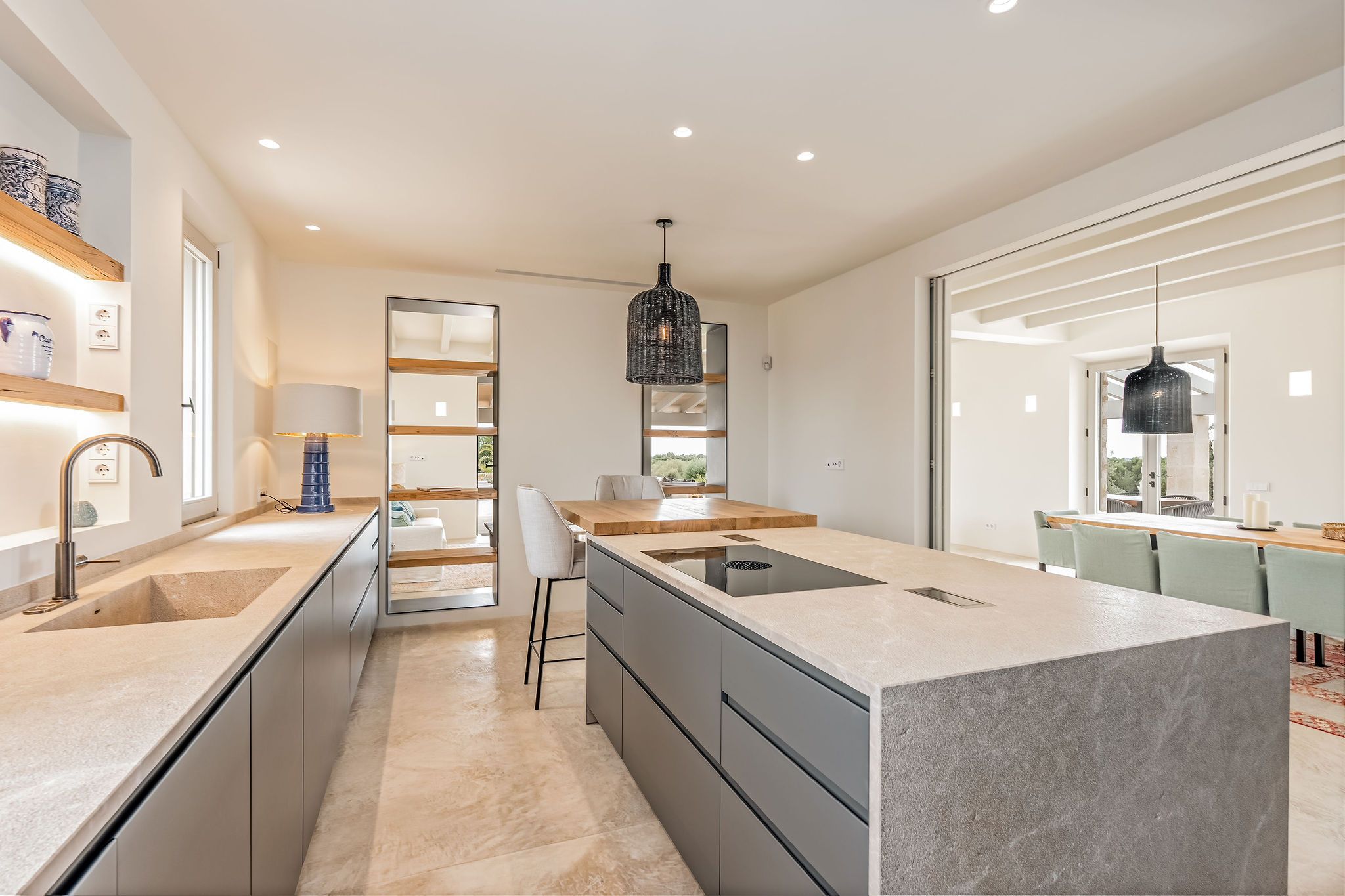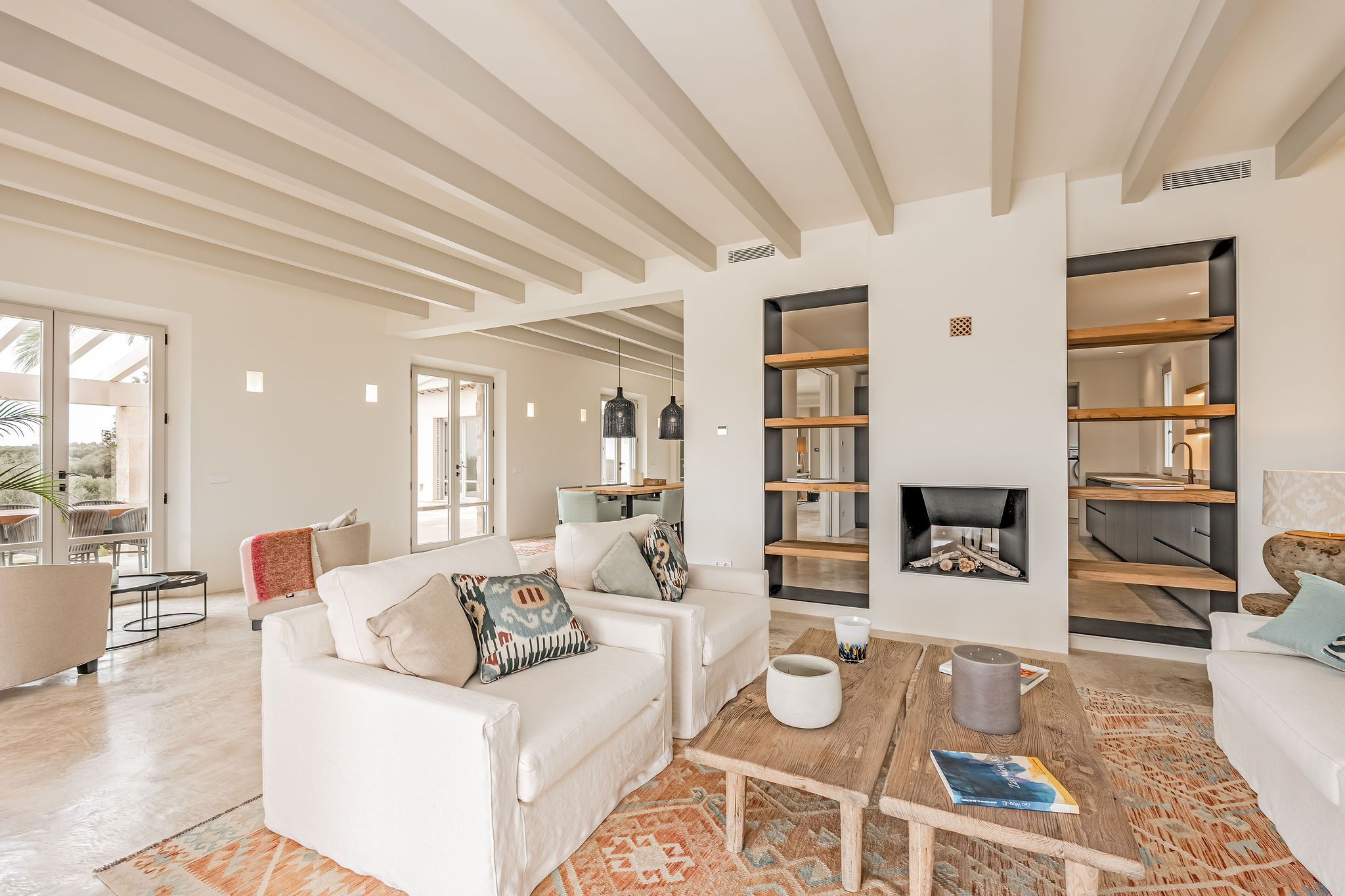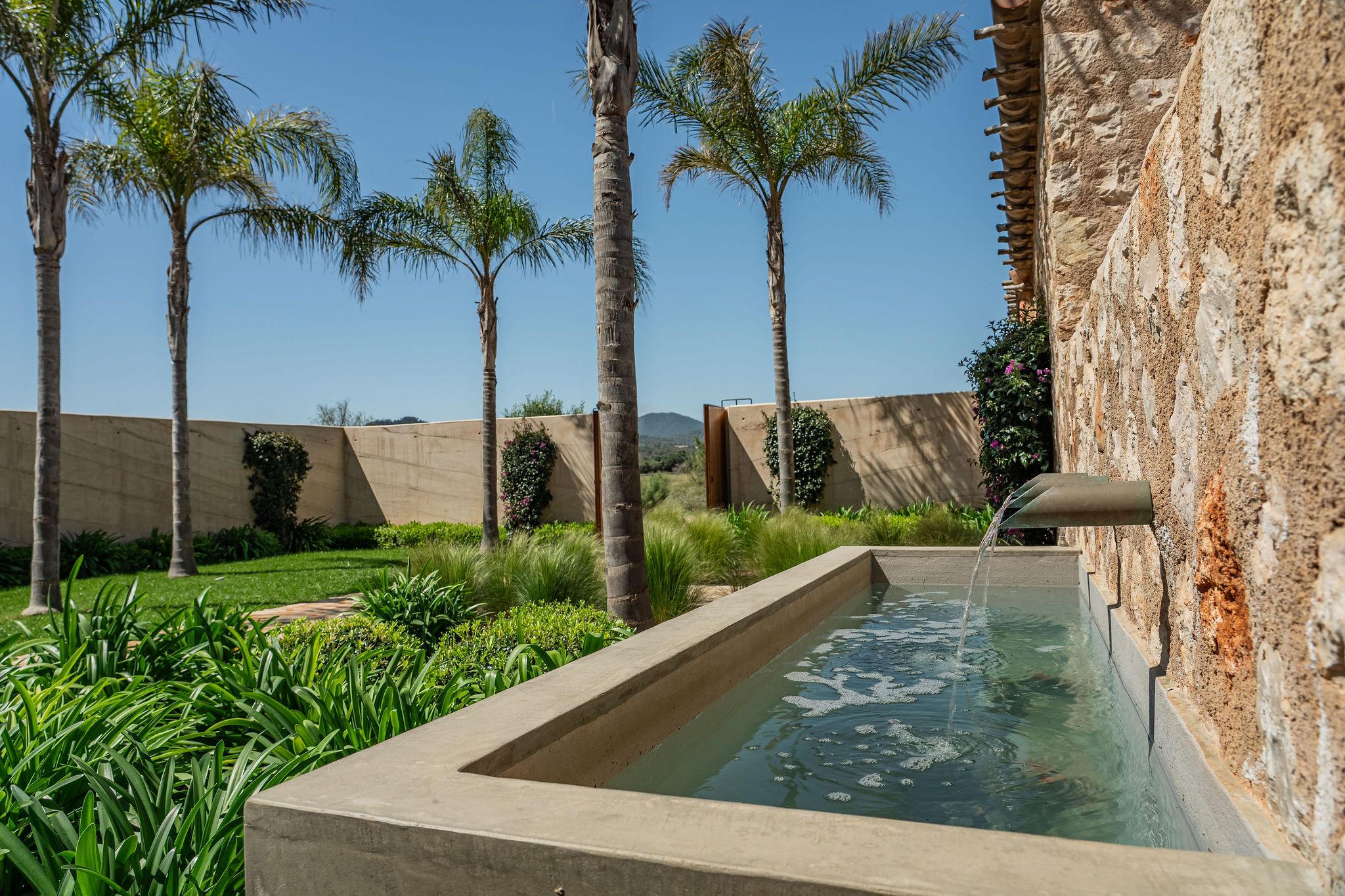 Denna eleganta finca i natursten ligger på en 6 hektar stor tomt mellan Portocolom och Cala Murada och erbjuder spektakulär utsikt över havet. Den yttre designen motsvarar den typiska mallorkinska stilen, medan interiören erbjuder ljusa rum med modern design. Naturliga element som trä och natursten smälter samman med harmonisk arkitektur med material av högsta kvalitet. Bottenvåningen imponerar med ett rymligt vardagsrum / matplats med designad öppen spis och ett angränsande, fullt utrustat kök med öppen planlösning. Härifrån kommer man ut på den täckta verandan. På bottenvåningen finns också fyra sovrum, vart och ett med eget badrum och en gästtoalett. På övre våningen ligger det stora sovrummet med eget badrum och omklädningsrum. Alla rum är luftkonditionerade och golvvärme garanterar ett behagligt inomhusklimat även under svalare dagar. Du kan tillbringa trevliga timmar med familj och vänner i trädgården som kräver lite underhåll. Här finns en pool på ca 60 m² med en mysig lounge och en veranda med en grillplats. Ett garage på ca 50 m² erbjuder plats för två bilar och har en toalett. Andra funktioner inkluderar ett larmsystem, ett smart hemsystem, ett automatiskt bevattningssystem, en brunn och anslutning till det kommunala elnätet.