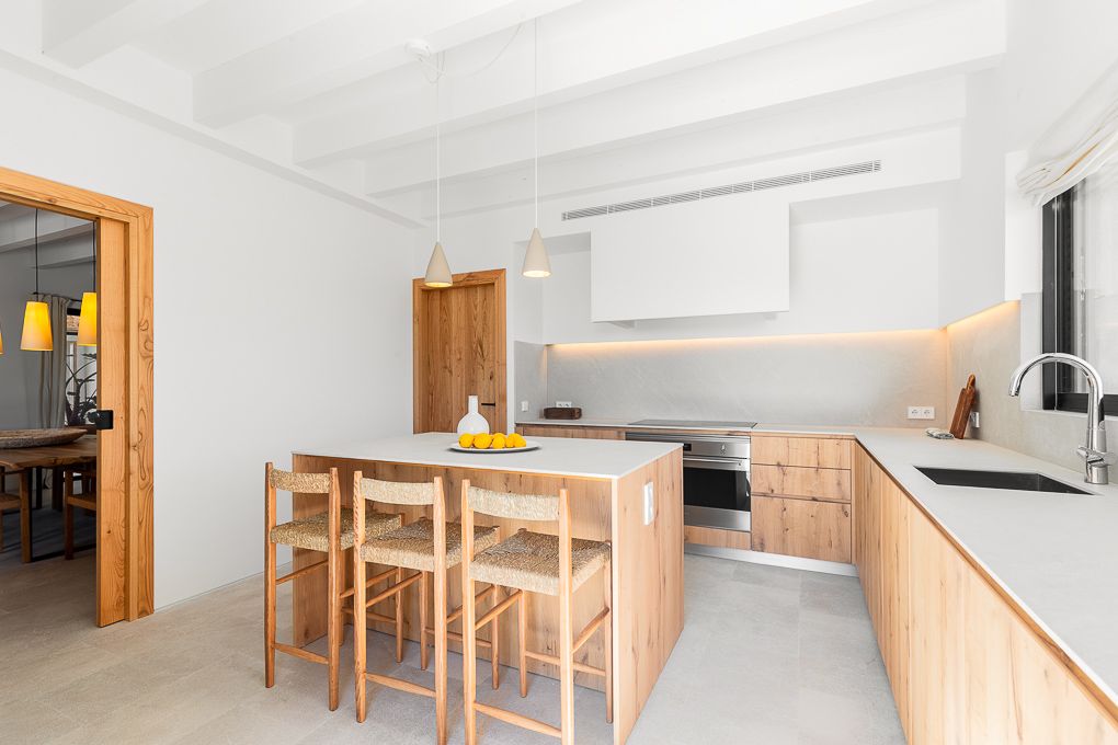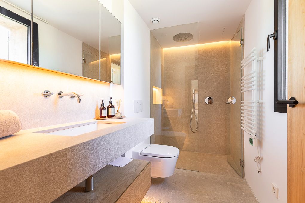 Denna nybyggda fastighet ligger i vackra omgivningar och erbjuder en fantastisk utsikt över Alcudia-bukten. Huset fascinerar genom den förstklassiga bearbetningen och användningen av högkvalitativa material. Framför allt den vackra naturstensfasaden ger fincan sin typiska mallorkinska charm. På den lägre nivån består fastigheten av entrén, det rymliga vardagsrummet med öppen spis och utgång till den täckta terrassen, en matsal, det rymliga köket, en gästtoalett och ett sovrum med eget badrum. På övervåningen finns två sovrum med eget badrum och det stora sovrummet med badrum, omklädningsrum och privat terrass. Fastigheten har golvvärme via luftvärmepump, integrerad luftkonditionering w / c, elnätanslutning och egen brunn. I källaren (ca 43 m2) finns plats för två till tre parkeringsplatser (ca 118 m2), ett biorum, en tvättstuga, ett teknikrum och ett badrum. Denna unika fastighet kompletteras av den drömlika medelhavsträdgården med många naturliga stenväggar och den stora saltvattenpoolen med solterrass.