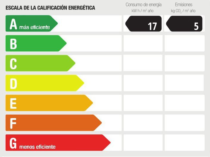 • Värde för energiförbrukning: 16.6 kWh/(m2*a) • Utsläpp av CO2: 5.2 kg/m2 • Klassning av CO2-utsläpp: A • Brandtyp: Värmepump • Klassificering av energieffektivitet: A