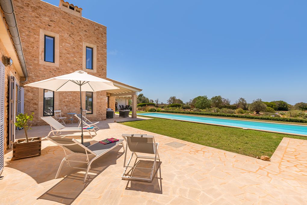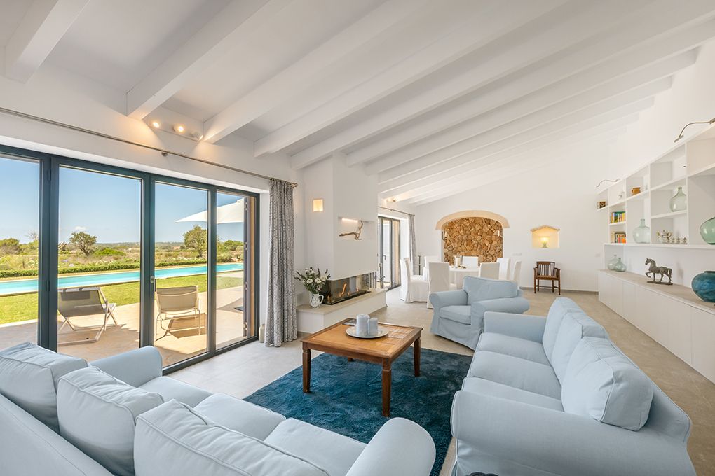 På en tomt på ca 14 200 m² ligger denna moderna finca, inredd med stor känsla för detaljer. Den imponerar med sin medelhavsdesign med fönster från golv till tak i hela huset och erbjuder en sensationell 360 ° utsikt över naturen till havet. Bottenvåningen har en öppen planlösning vardagsrum / matplats med öppen spis och ett fullt utrustat modernt kök, som är direkt anslutet till matplatsen. Härifrån har du tillgång till en terrass, en underbar plats att njuta av solnedgångar. På denna våning finns två sovrum med eget badrum. På övervåningen hittar du det stora sovrummet med eget badrum, omklädningsrum och magnifik utsikt så långt som Cabrera Island och Medelhavet i ena riktningen och Tramuntana-bergen i den andra. Dessutom finns det ett annat rum med eget badrum, som kan användas som kontor eller sovrum. Golvvärme ger ett behagligt inomhusklimat även under svalare dagar. I den välskötta trädgården hittar du poolen på 4 x 20 m och delvis täckta terrasser med grill, där du kan njuta av avkopplande timmar med familj och vänner. Från garaget, som erbjuder plats för två fordon, har du också direkt tillgång till huset. Den populära byn SesSalines samt Santanyì med sin veckomarknad, många restauranger, kaféer och shoppingmöjligheter kan nås på några minuter med bil.