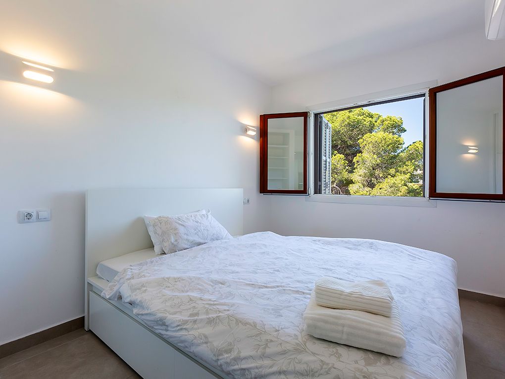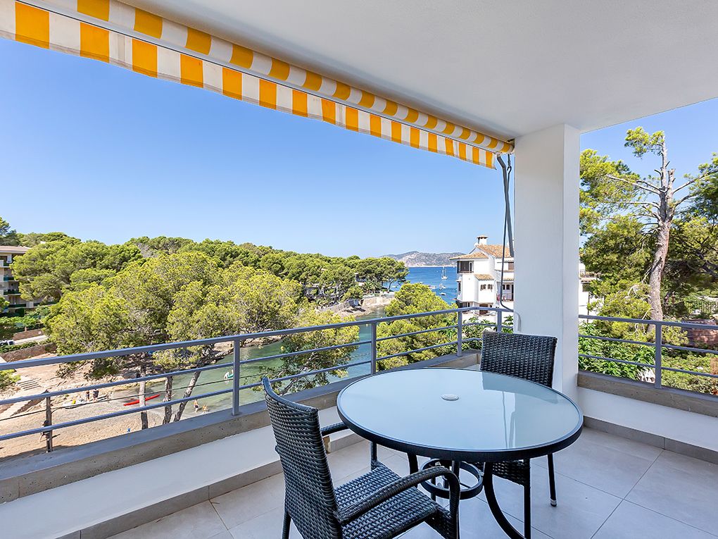 Denna moderna lägenhet nära centrum av Santa Ponsa har totalrenoverats och ligger direkt vid den lilla stranden i Santa Ponsa i den första havslinjen. Vattnet ligger bara 3 minuters promenad bort. Det finns totalt 2 fullt utrustade sovrum, ett badrum och en öppen planlösning mellan vardagsrum och matplats. Från balkongen kan du se den turkosblå bukten. Lägenheten är fullt utrustad, har tvättmöjligheter och en privat parkeringsplats framför husets entré.