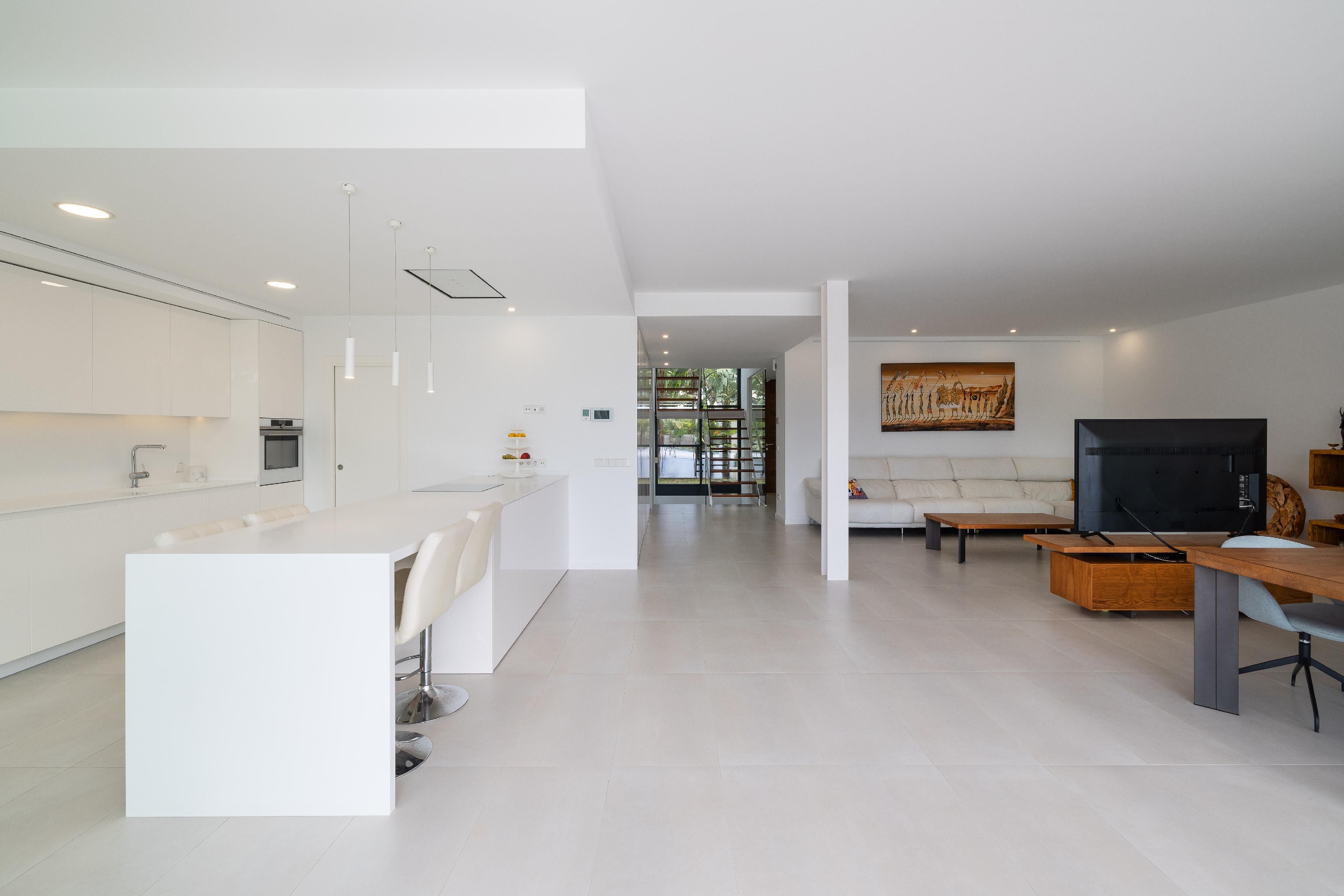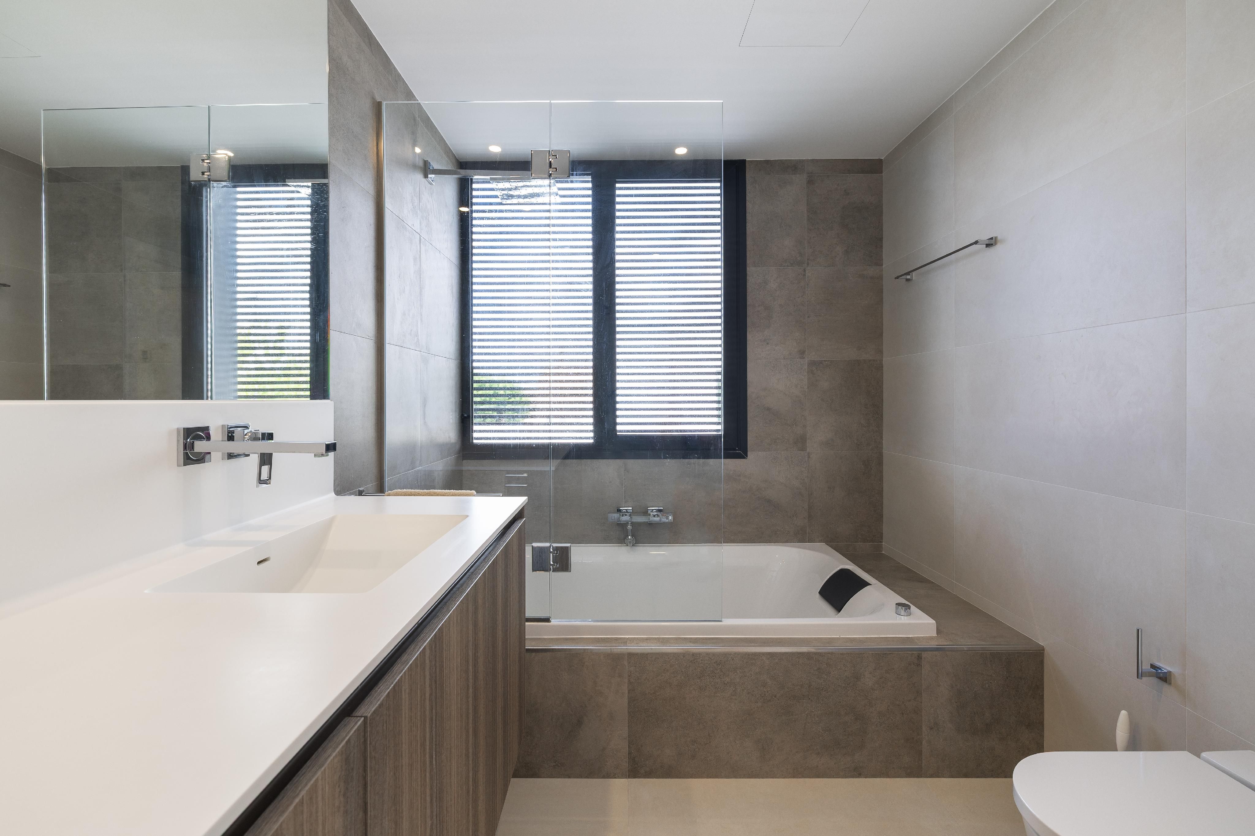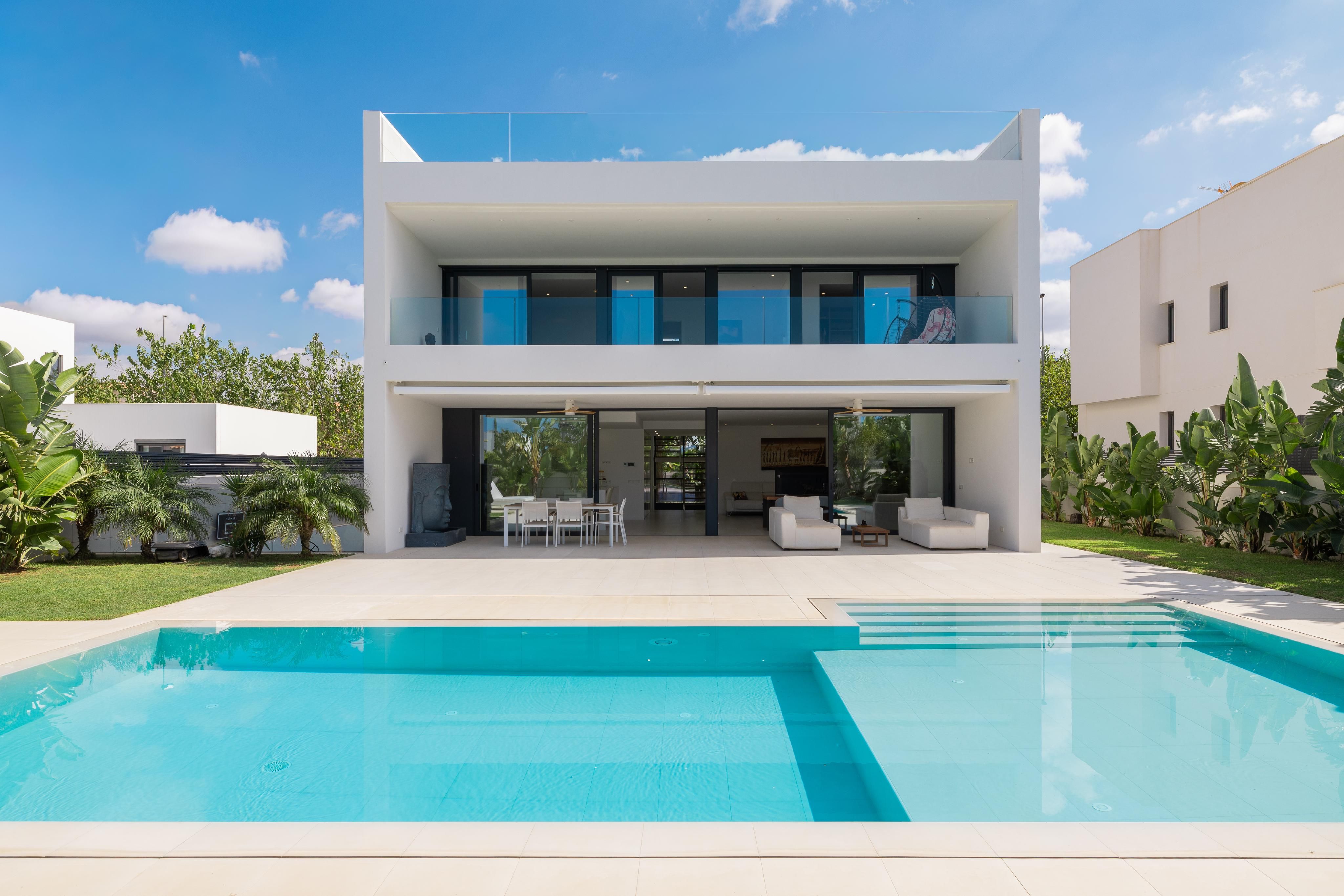 Denna moderna nybyggda villa från 2020 är nästan unik när det gäller material och finish. Villan byggdes med stor uppmärksamhet på detaljer och de bästa kvaliteterna. Börjar med Irroco-ingångsdörren och de tredubbla säkerhetsfönstren med UV-skydd till Grohe-sanitetsutrustningen, WC med fjärrkontroll och garaget för sju bilar. Varje våning har nästan 180 m². Även källaren och takterrassen. På bottenvåningen finns vardagsrum/matsal med kök i öppen planlösning och angränsande skafferi, ett sovrum med eget badrum och en gästtoalett. På övervåningen finns ytterligare fyra sovrum, varav två delar på ett badrum som kan nås från båda sidor. Master-sviten avrundas med en stor täckt terrass och en klädkammare. Det finns också en tvättstuga på övervåningen. En annan höjdpunkt i huset är de inbyggda garderoberna från golv till tak, som finns i hela huset och erbjuder oändligt lagringsutrymme. Det hela avrundas med en 10x4 meter stor saltvattenpool. Ytterligare funktioner inkluderar: Golvvärme och luftkonditionering via luftvärmepump, solpanel med lagringstank för varmvatten, osmossystem, avkalkningssystem, internetanslutning i alla sovrum.