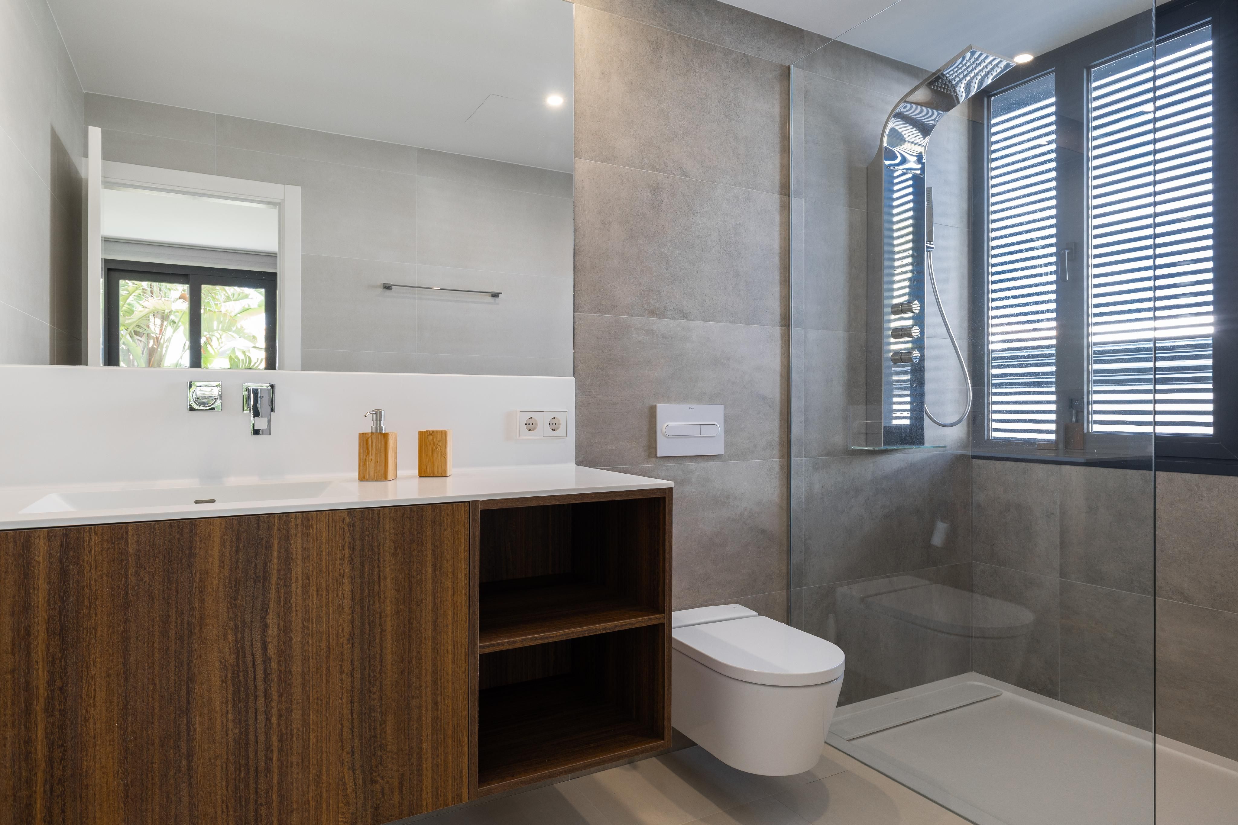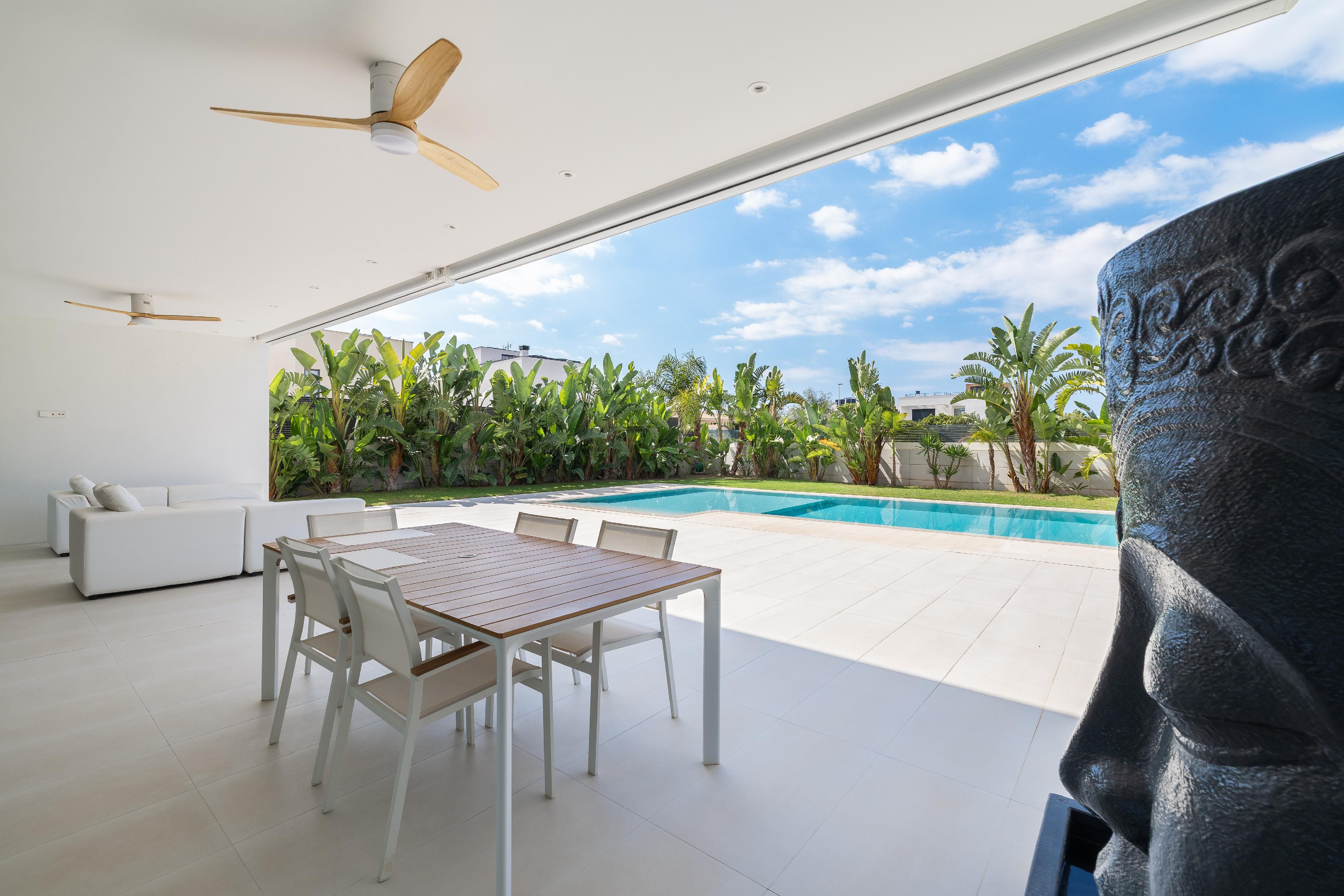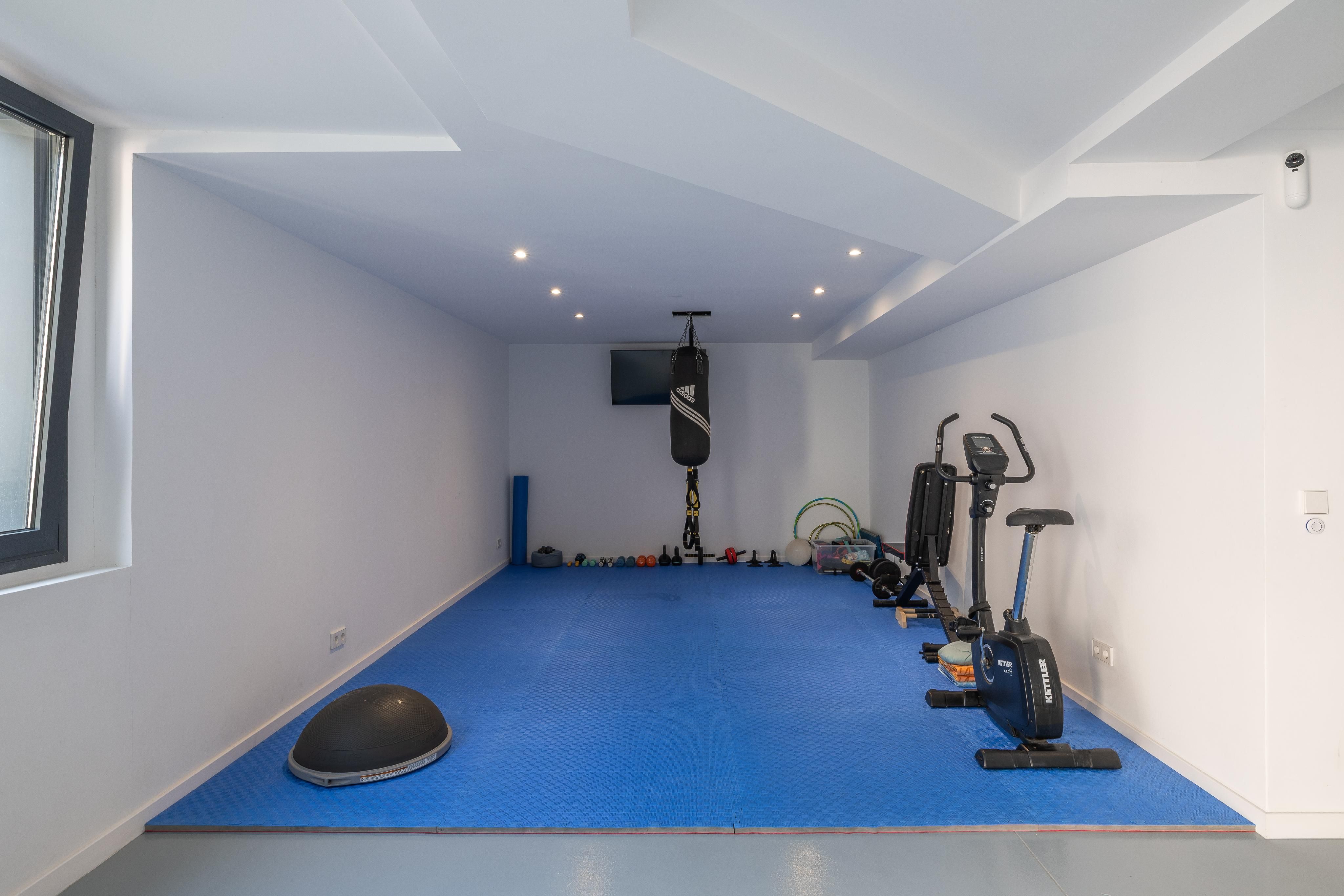 Denna moderna nybyggda villa från 2020 är nästan unik när det gäller material och finish. Villan byggdes med stor uppmärksamhet på detaljer och de bästa kvaliteterna. Börjar med Irroco-ingångsdörren och de tredubbla säkerhetsfönstren med UV-skydd till Grohe-sanitetsutrustningen, WC med fjärrkontroll och garaget för sju bilar. Varje våning har nästan 180 m². Även källaren och takterrassen. På bottenvåningen finns vardagsrum/matsal med kök i öppen planlösning och angränsande skafferi, ett sovrum med eget badrum och en gästtoalett. På övervåningen finns ytterligare fyra sovrum, varav två delar på ett badrum som kan nås från båda sidor. Master-sviten avrundas med en stor täckt terrass och en klädkammare. Det finns också en tvättstuga på övervåningen. En annan höjdpunkt i huset är de inbyggda garderoberna från golv till tak, som finns i hela huset och erbjuder oändligt lagringsutrymme. Det hela avrundas med en 10x4 meter stor saltvattenpool. Ytterligare funktioner inkluderar: Golvvärme och luftkonditionering via luftvärmepump, solpanel med lagringstank för varmvatten, osmossystem, avkalkningssystem, internetanslutning i alla sovrum.