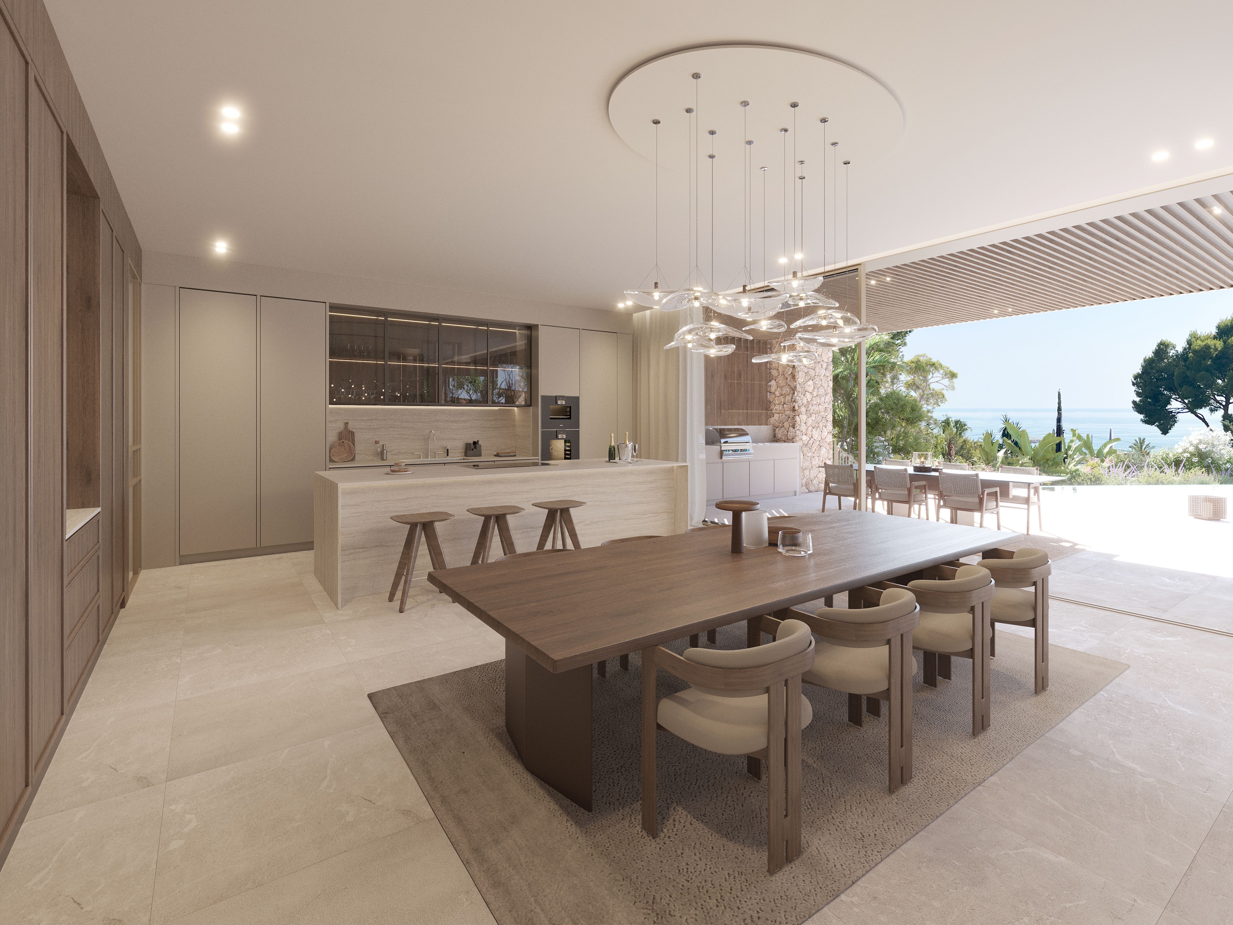 Denna exceptionella villa ligger med hisnande utsikt över Medelhavet och kombinerar på ett mästerligt sätt modern elegans, naturligt ljus och hållbar design. Med 589 m² boyta på en 970 m² stor tomt erbjuder den en lugn och lyxig livsstil på en av de mest eftertraktade kustplatserna. På bottenvåningen möts du av ett ljust vardagsrum med öppen planlösning och matplats som flyter sömlöst ut på en rymlig terrass, en chill-out lounge och en saltvattenpool - allt mot havet. Den flytande övergången mellan inomhus- och utomhusområden inbjuder dig att koppla av och underhålla, inramad av panoramautsikt och Medelhavsljus. Den övre våningen är tillägnad lugn och avskildhet och har en rymlig master-svit med klädkammare och eget badrum samt ytterligare tre stilfullt designade sovrumssviter som kombinerar komfort och elegans. Källaren avrundar fastigheten med ett privat gym, en vinkällare, ett biorum och ett garage för två bilar. Varje aspekt har utformats med uppmärksamhet på detaljer, inklusive en vackert anlagd trädgård. Interiören kännetecknas av högkvalitativa ytbehandlingar, inklusive Gris Zarzi-golv och skräddarsydda köksapparater. Villan har ett KNX-kontrollerat luftkonditioneringssystem med golvvärme och komfortkylning för komfort året runt. Hållbarheten står i centrum för huset: solpaneler för varmvatten och solcellssystem säkerställer energieffektivitet och möjliggör ett lyxigt boende med ett minimalt ekologiskt fotavtryck. Färdigställandet är planerat till januari 2026 - ett arkitektoniskt mästerverk som kombinerar innovation, medelhavsskönhet och modern livsstil.