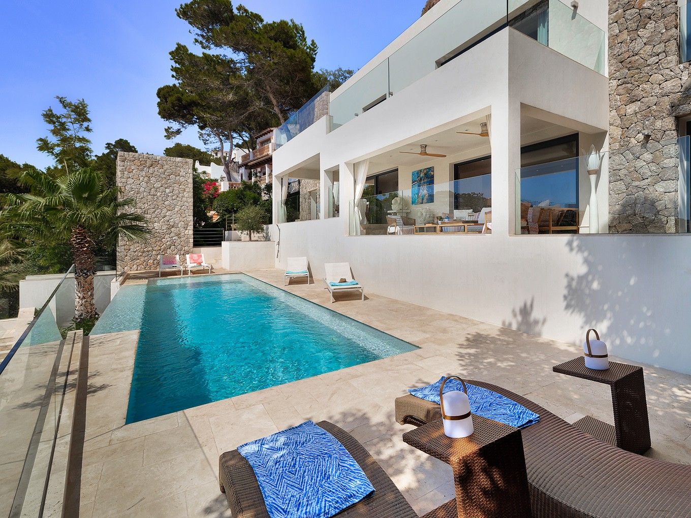 Denna moderna villa har spektakulär havsutsikt och solnedgångar och ligger i det populära området Cala Llamp i Port Andratx. Tack vare det upphöjda läget, flera meter över gatunivån, garanteras avskildhet. Villan renoverades 2015 och erbjuder fyra rymliga sovrum, varav tre har en-suite badrum. Den berömda "Beach Club" med direkt tillgång till havet, saltvattenpool, restaurang och bar ligger bara några minuters promenad bort. Strandpromenaden i Port Andratx med många restauranger, barer och butiker kan nås på 5 minuter med bil. Ytterligare funktioner inkluderar: Hiss, golvvärme, central luftkonditionering, pool, flera terrassområden öppna och täckta, amerikanskt kök, gästtoalett, tre badrum med eget badrum och ett dubbelgarage.
