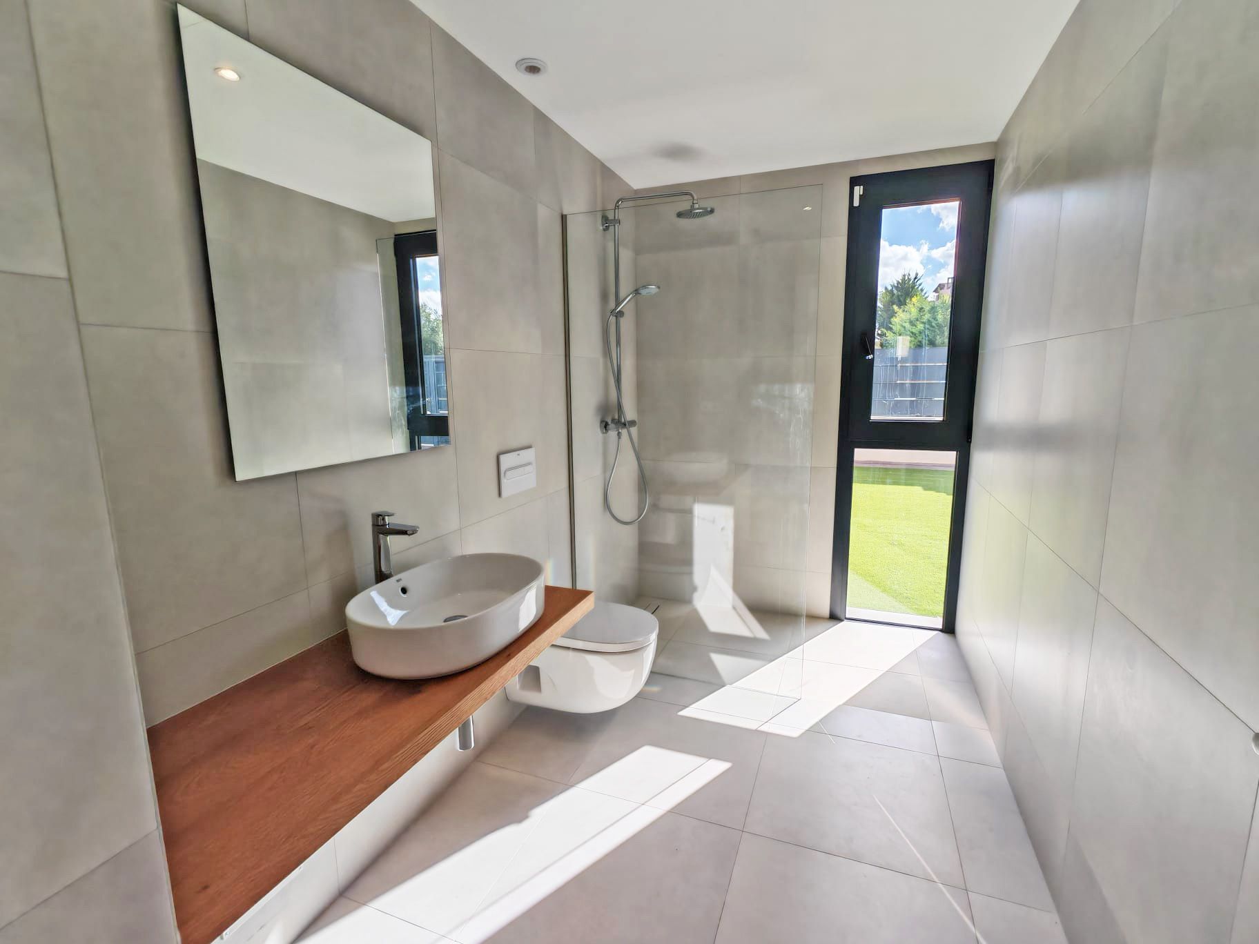 På övervåningen kan du njuta av två stora sovrum, båda med eget badrum, som erbjuder avskildhet och komfort. Dessutom ligger det tekniska rummet på denna våning tillsammans med tvättstugan, vilket optimerar husets funktionalitet.