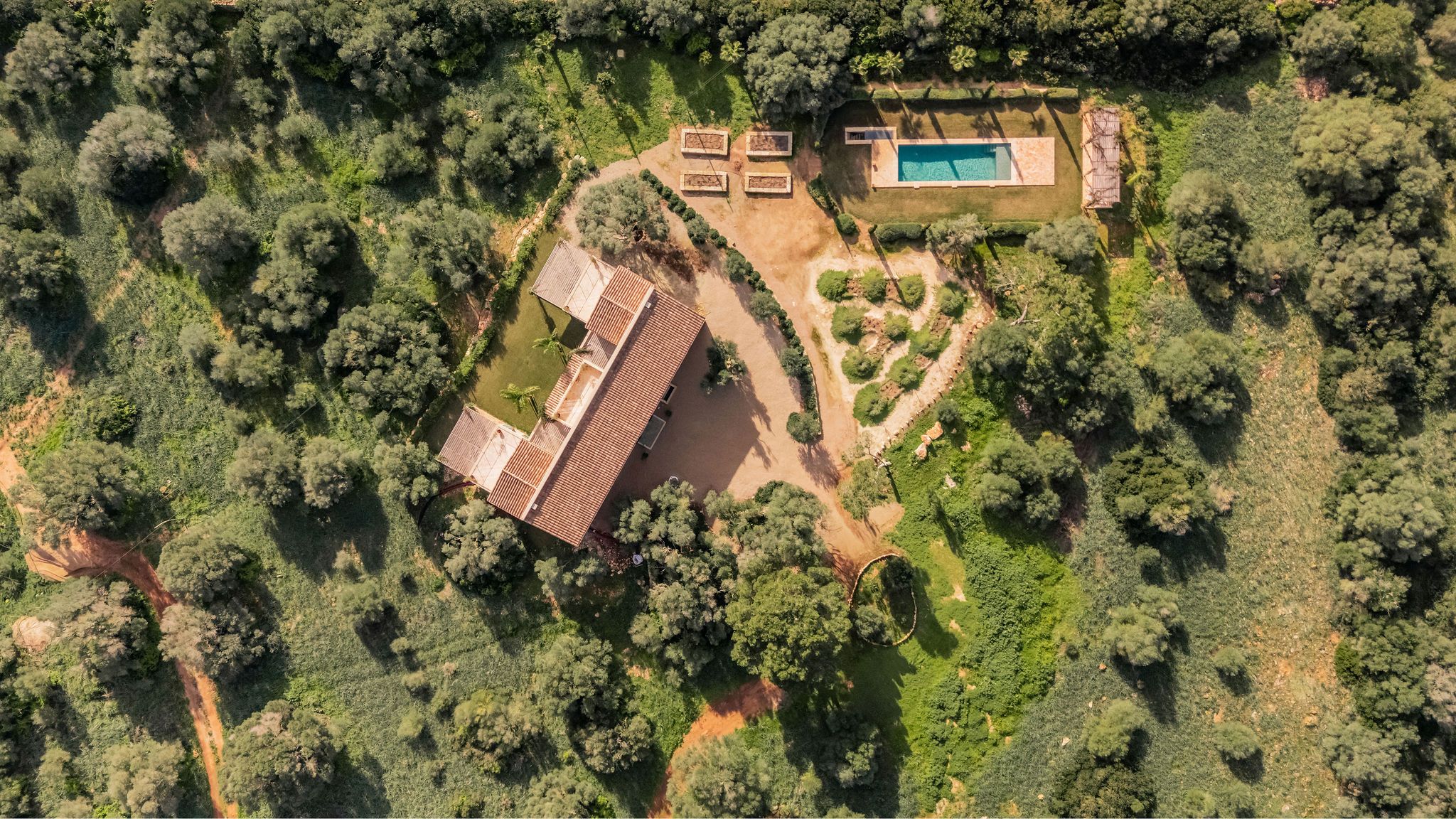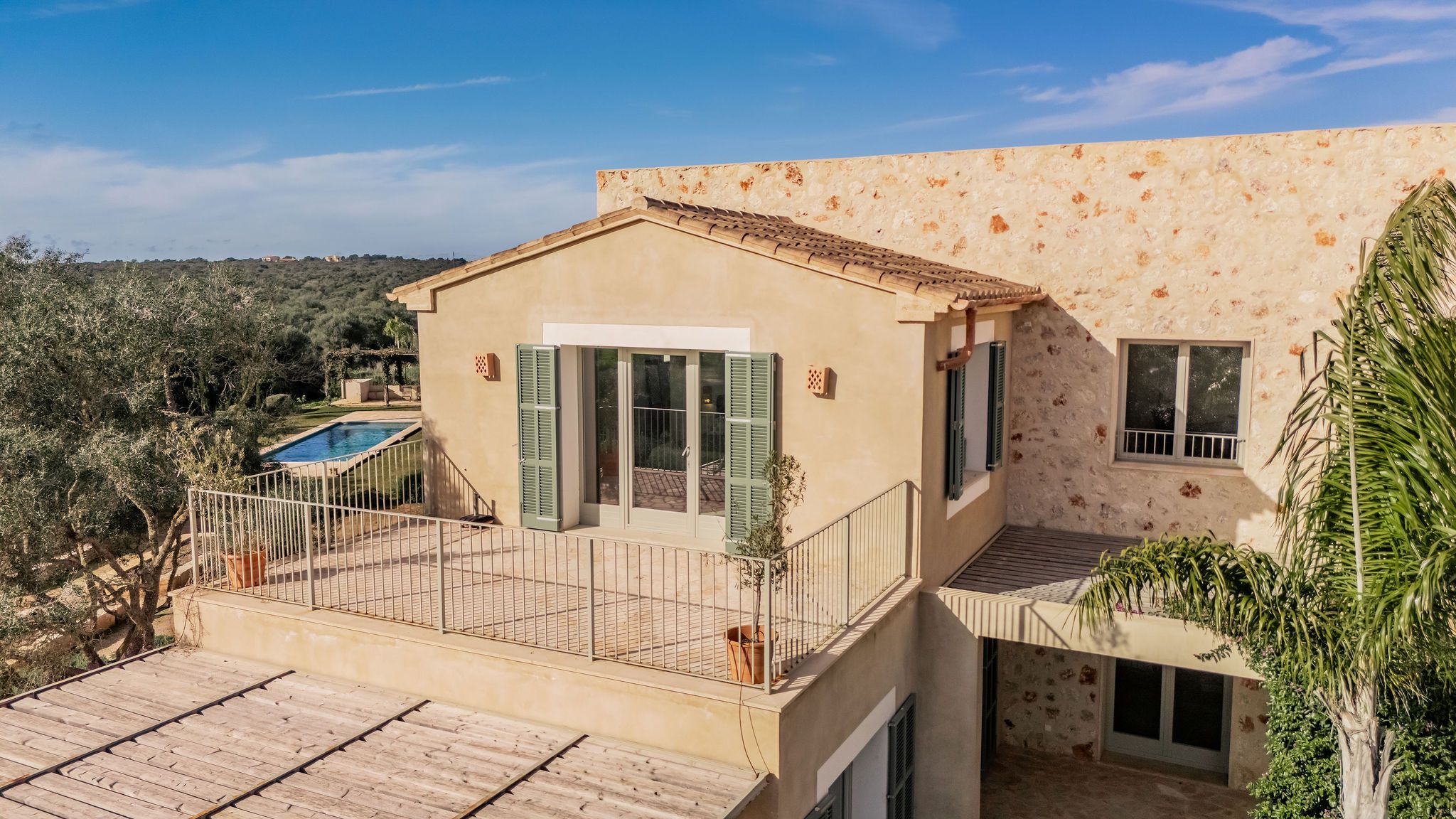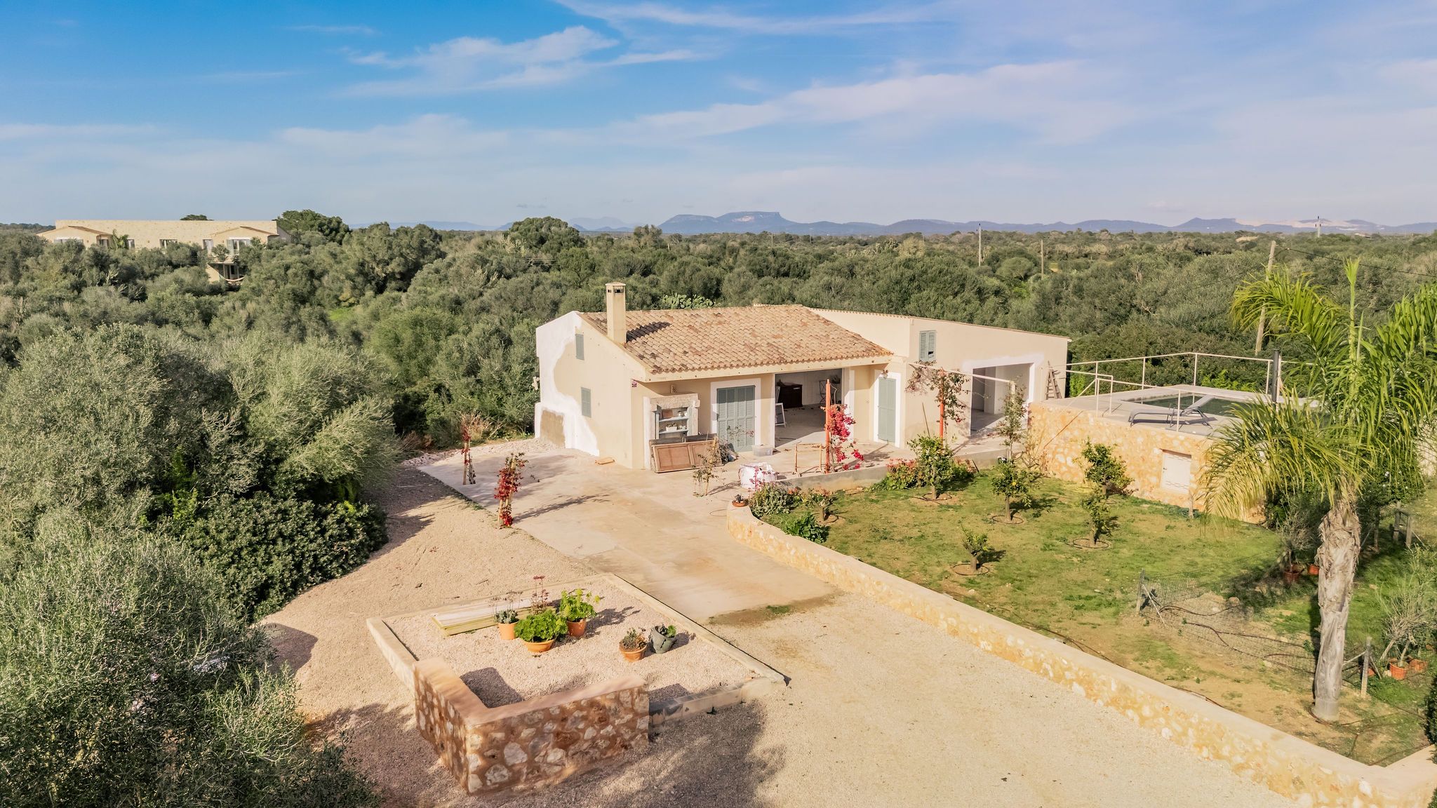 Bara några minuter från den karibiska, skyddade naturstranden Es Trenc byggs denna imponerande finca på en tomt på ca 30.000 m² nära Sa Rápita. Färdigställandet är planerat till slutet av 2023. Från utsidan, som är typisk för Medelhavsområdet, hittar du inuti ljusa rum i modern design i kombination med naturliga element som trä och natursten. När du kommer in kommer du direkt in i en rymlig vardagsrumsdel på cirka 60m2 med tillgång till två vingar. I den vänstra flygeln finns det fullt utrustade köket med mysig matplats med öppen spis. I den högra flygeln finns två sovrum, alla med eget badrum och tillgång till terrassen med utsikt över det omgivande landskapet. Den övre våningen har ett annat vardagsrum, en fantastisk master svit med omklädningsrum och badrum en suite och ytterligare två sovrum med badrum en suite, två av dem med tillgång till en terrass med fantastisk panoramautsikt över havet och ön Cabrera. Golvvärme samt luftkonditionering garanterar också en trevlig atmosfär i huset året runt. Trädgården är anlagd med mycket kärlek i medelhavsstil och bevattnas automatiskt. Där hittar du poolen på cirka 50 m² och en rymlig terrass, som inbjuder dig att tillbringa tid med familj och vänner. En separat byggnad på 150 m² kan omvandlas till ett pensionat. Till Campos, med olika shoppingmöjligheter och veckomarknaden behöver du bara 10 minuter med bil. Småbåtshamnen Sa Rapita med sin vackra strand ligger bara några minuter bort. Till flygplatsen tar det bara 35 minuter med bil.