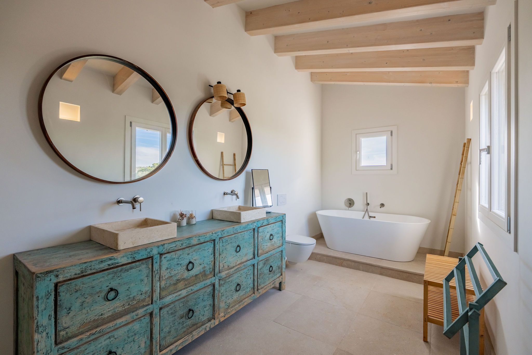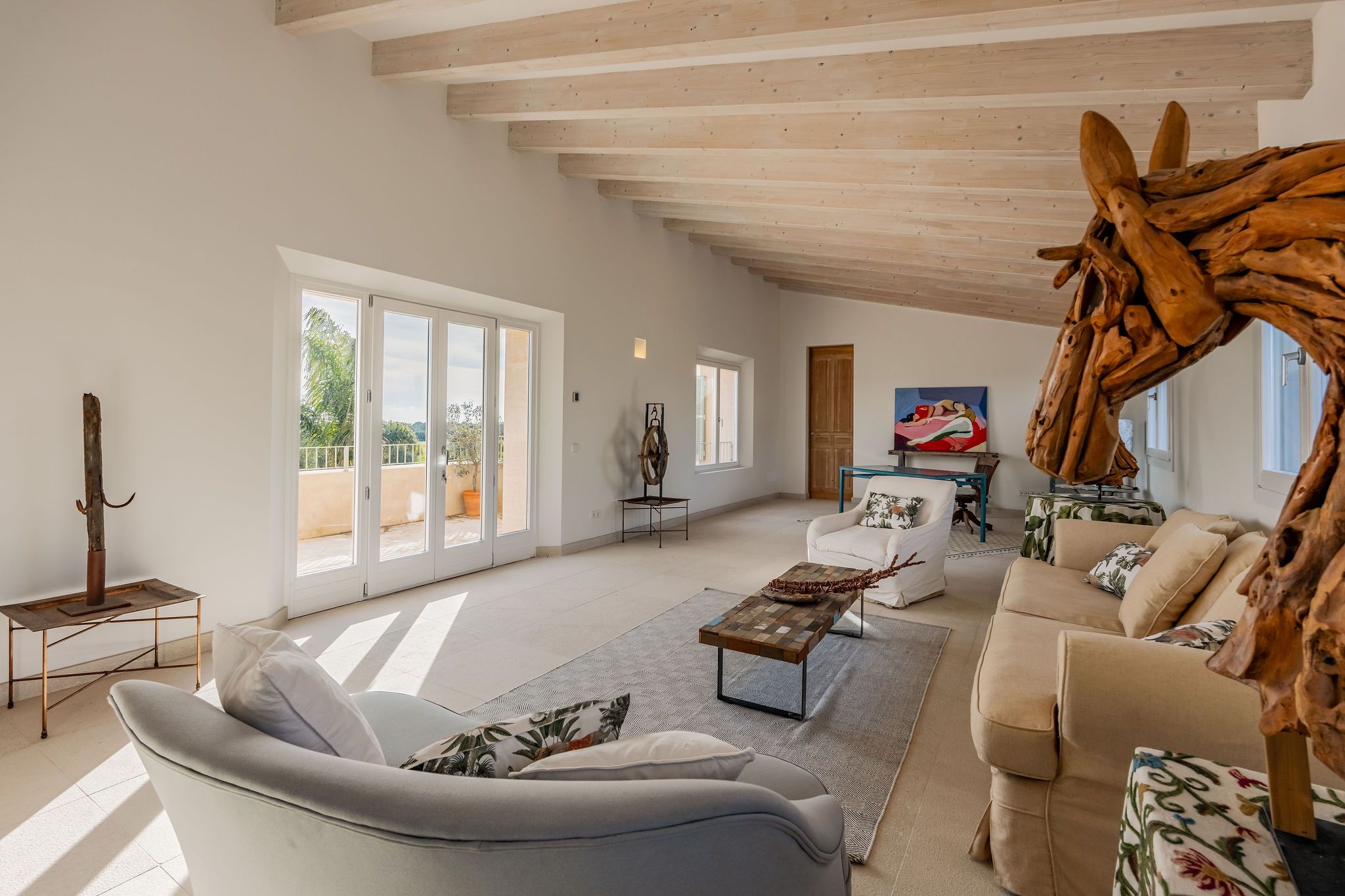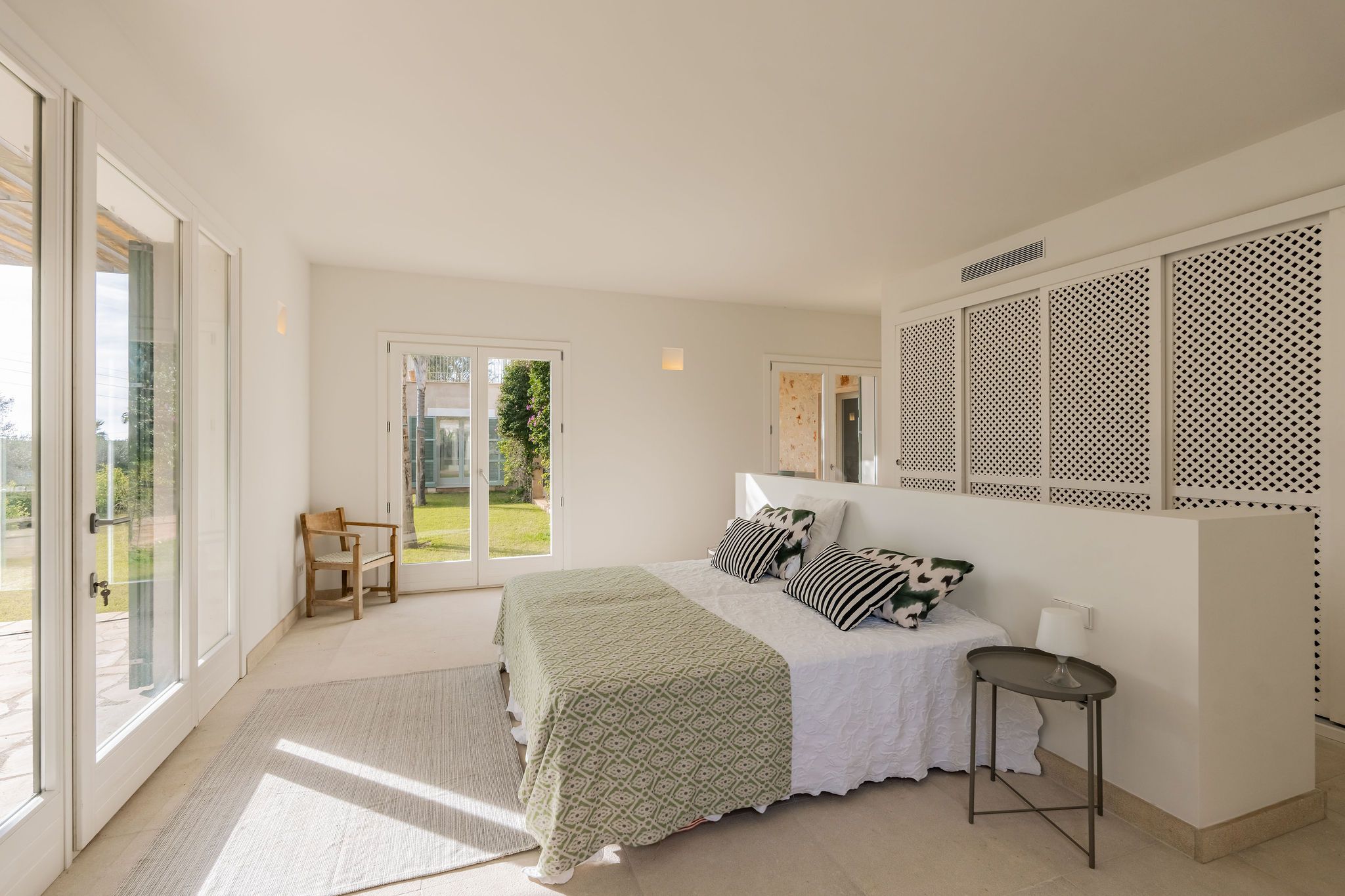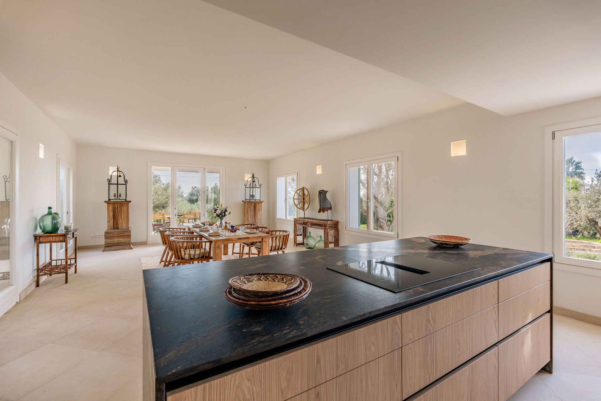 Bara några minuter från den karibiska, skyddade naturstranden Es Trenc byggs denna imponerande finca på en tomt på ca 30.000 m² nära Sa Rápita. Färdigställandet är planerat till slutet av 2023. Från utsidan, som är typisk för Medelhavsområdet, hittar du inuti ljusa rum i modern design i kombination med naturliga element som trä och natursten. När du kommer in kommer du direkt in i en rymlig vardagsrumsdel på cirka 60m2 med tillgång till två vingar. I den vänstra flygeln finns det fullt utrustade köket med mysig matplats med öppen spis. I den högra flygeln finns två sovrum, alla med eget badrum och tillgång till terrassen med utsikt över det omgivande landskapet. Den övre våningen har ett annat vardagsrum, en fantastisk master svit med omklädningsrum och badrum en suite och ytterligare två sovrum med badrum en suite, två av dem med tillgång till en terrass med fantastisk panoramautsikt över havet och ön Cabrera. Golvvärme samt luftkonditionering garanterar också en trevlig atmosfär i huset året runt. Trädgården är anlagd med mycket kärlek i medelhavsstil och bevattnas automatiskt. Där hittar du poolen på cirka 50 m² och en rymlig terrass, som inbjuder dig att tillbringa tid med familj och vänner. En separat byggnad på 150 m² kan omvandlas till ett pensionat. Till Campos, med olika shoppingmöjligheter och veckomarknaden behöver du bara 10 minuter med bil. Småbåtshamnen Sa Rapita med sin vackra strand ligger bara några minuter bort. Till flygplatsen tar det bara 35 minuter med bil.
