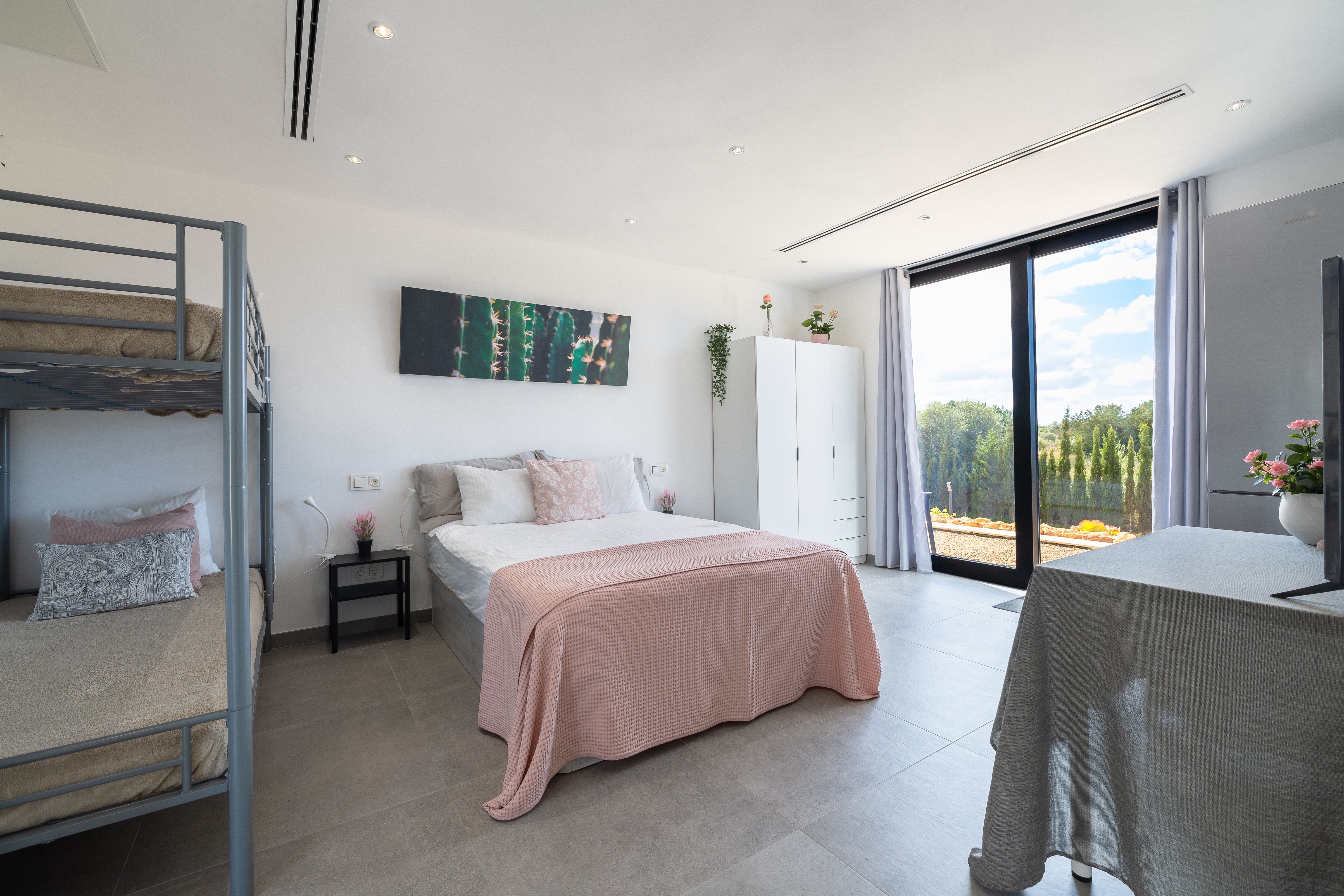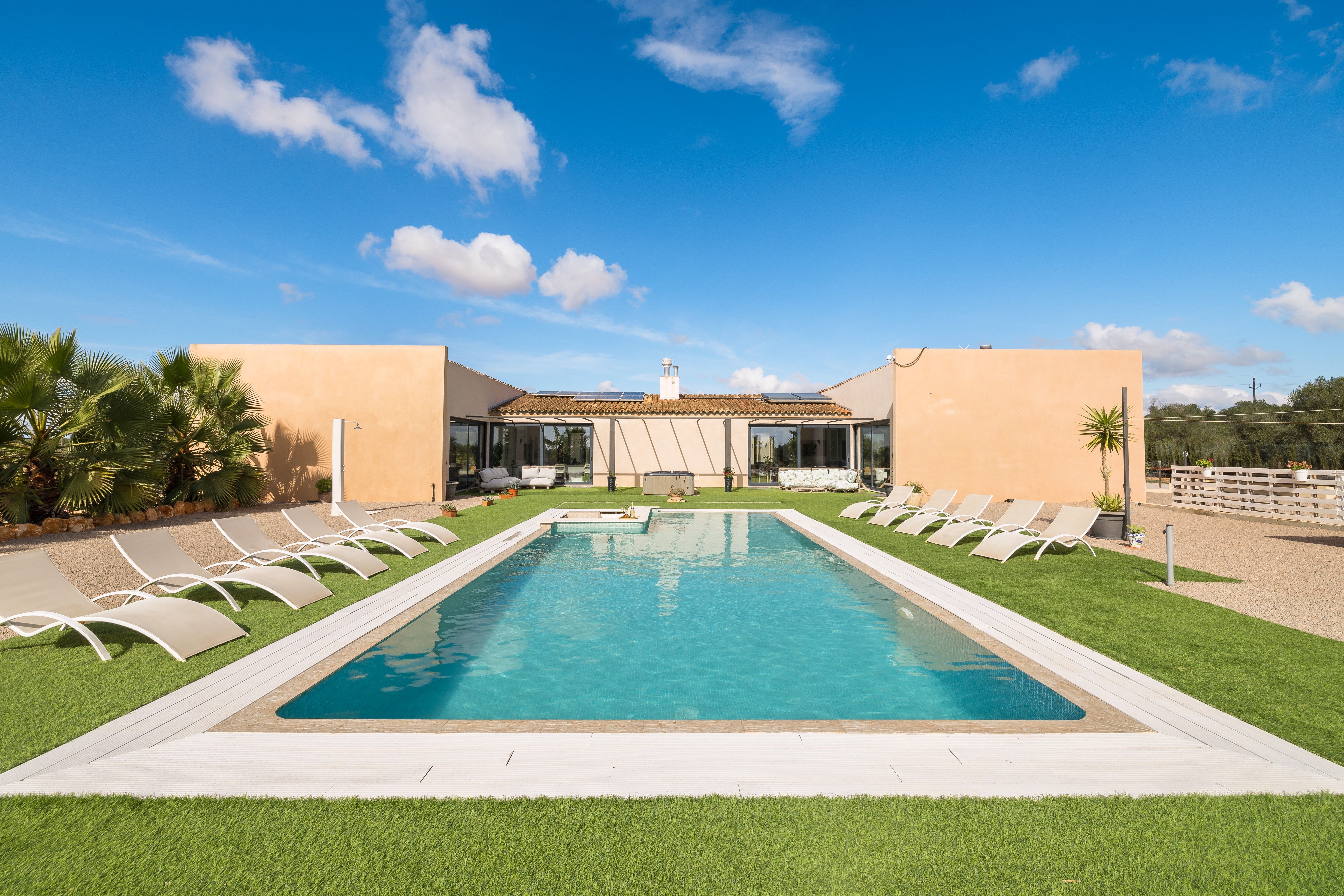 Denna finca ligger i kommunen Llucmajor, bara 5 km från byns centrum, i ett lugnt område som också är mycket lättillgängligt. Fincan är helt inhägnad och har ett solsystem som försörjer hela fastigheten. Den stora tomten på ca 16.500 m² är helt plan och fastigheten är fördelad på en våning med en stor källare där alla maskiner finns. Huset har fem rymliga sovrum med separata badrum och kännetecknas av sin loftstil. Husets rymliga rum översvämmas av ljus tack vare de stora fönstren och den speciella "H"-formen. Poolen kännetecknas av sin storlek och har en minibar med pallar. Om köparen önskar åtar sig säljaren att modifiera köket enligt hans önskemål. Andra funktioner: Vatten med lastbil, el via solpaneler, luftkonditionering med kanaler, öppen spis, garage, golvvärme, larmsystem och hemautomation.