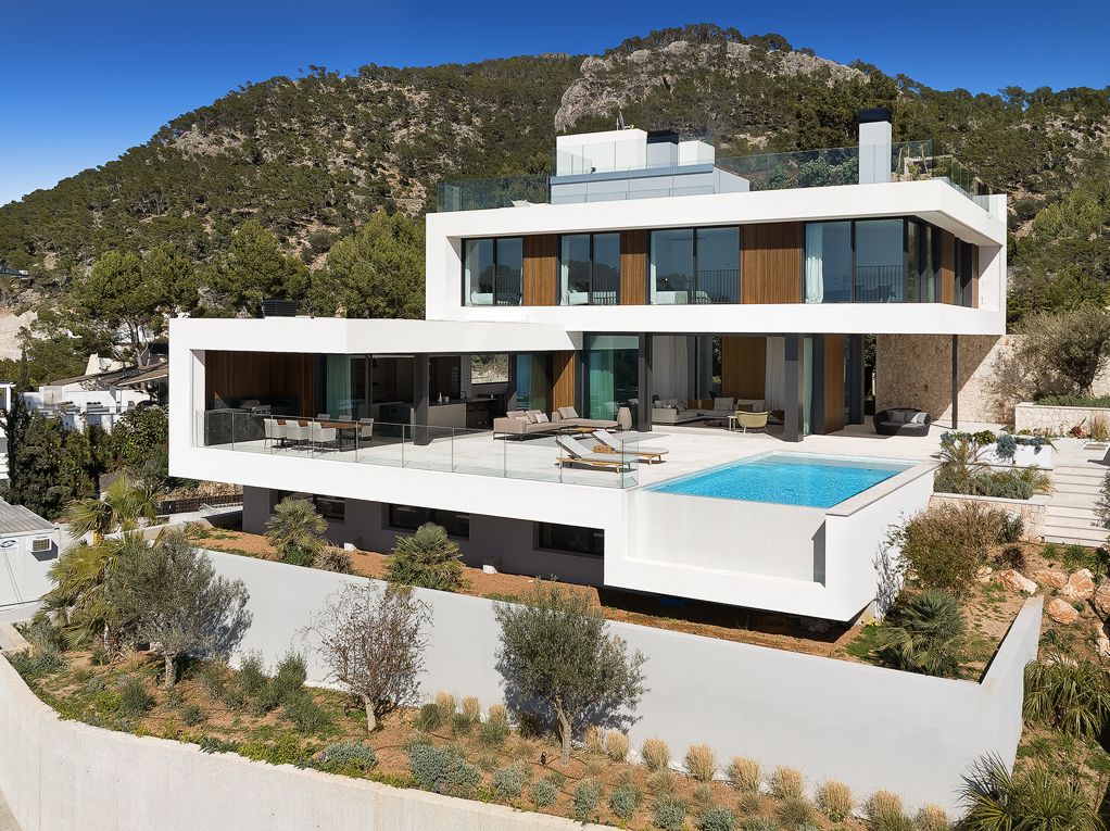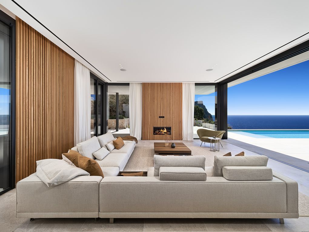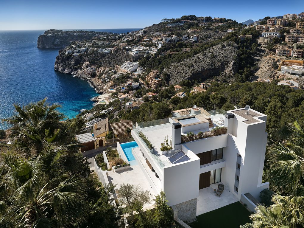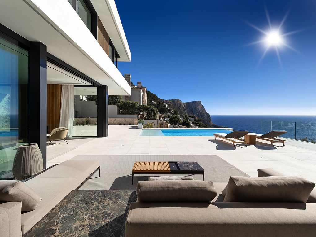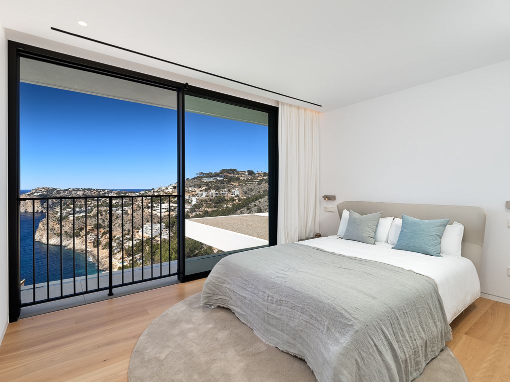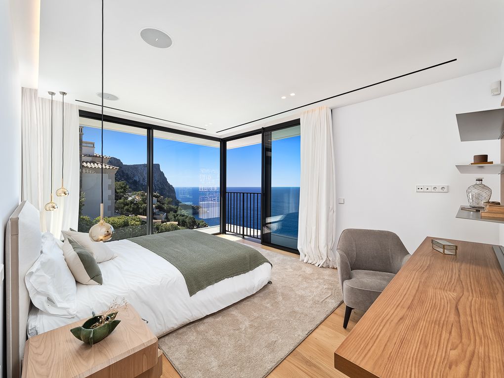 Denna nybyggda villa i sydvästläge med panoramautsikt över havet och spektakulära solnedgångar ligger på en av de mest privilegierade platserna i Cala Llamp. Den övre våningen erbjuder 4 sovrum, alla med eget badrum och fantastisk havsutsikt från alla rum. På bottenvåningen hittar du det rymliga vardagsrummet som leder till det öppna köket och matsalen, och in mot den stora täckta terrassen med utekök och matplats, med utsikt över infinitypoolen och Medelhavet. På baksidan av denna nybyggda villa finns en generöst anlagd trädgård med gräsmatta. I källaren erbjuder fastigheten spa och fitnessområde samt ytterligare 2 sovrum. Det rymliga garaget ger plats för 3 bilar. Alla våningar är internt anslutna med en hiss. Ytterligare funktioner inkluderar golvvärme med värmepump, trädgård med gräsmatta, hiss, pool på roofterrace, utekök.
