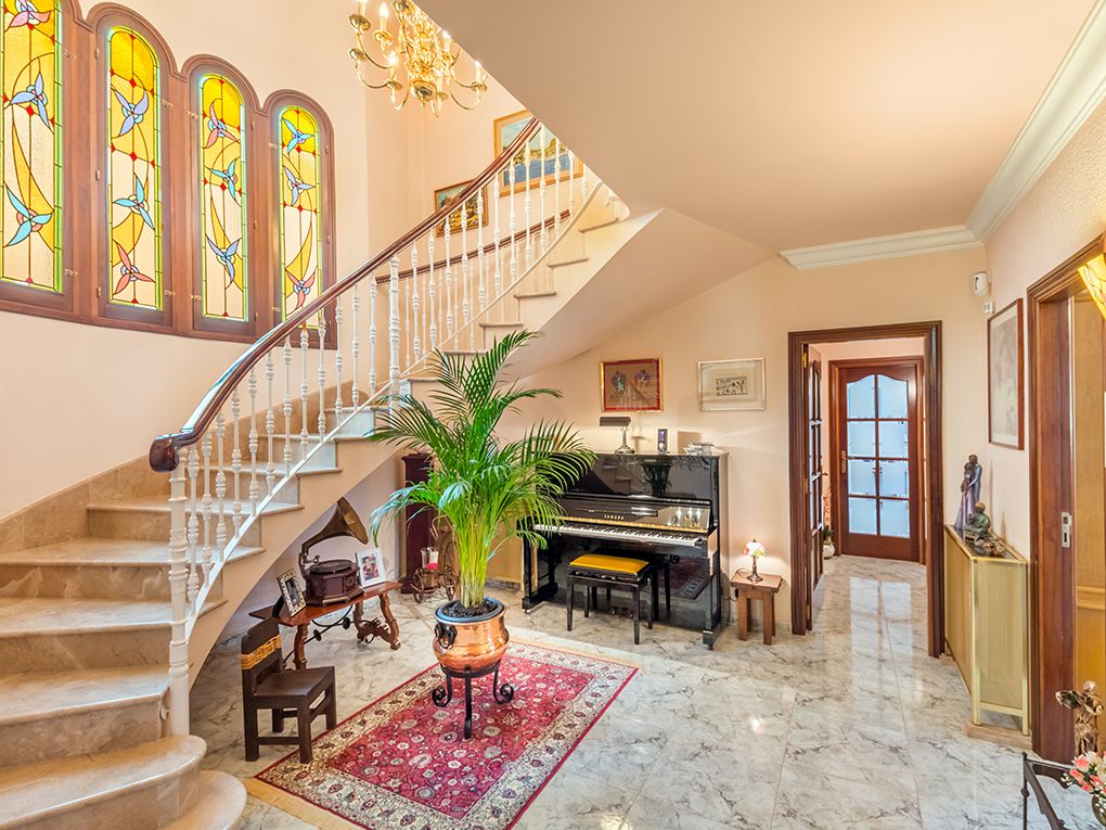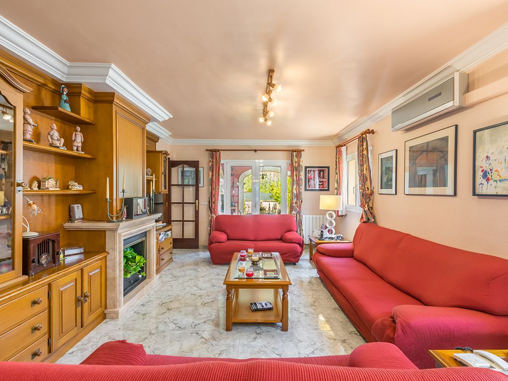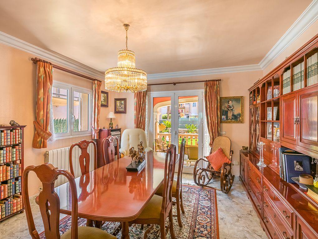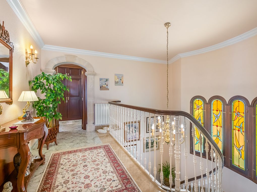 Denna magnifika villa med en yta på ca 655 kvm ligger i det lugna och eftertraktade bostadsområdet Las Maravillas - Playa de Palma, en vacker välskött park och nära flygplatsen och centrum av Palma. Den ljusa villan är byggd med utmärkta kvaliteter, elegant stil och med stor uppmärksamhet på detaljer. Fastigheten har ca. 324 kvm och är fördelad på två våningar som nås genom en rymlig hall som leds av en spektakulär trappa. Totalt har villan fem dubbelrum (ett med terrass) med inbyggda garderober, tre kompletta badrum och en gästtoalett med dusch. Det stora sovrummet har en privat terrass och ett eget badrum med hydromassagebadkar. Fastigheten har också ett fullt utrustat kök med separat tvättstuga och skafferi, ett elegant vardagsrum och en rymlig matsal. Båda rummen har vacker utsikt över trädgården och tillgång till utsidan genom två mysiga verandor, en av dem med en grill. Villan har en källare, ett täckt garage, vackra trädgårdsområden och en stor pool. En idealisk plats för avkoppling, solbad och kul med familj och vänner. Fastigheten har extrafunktioner som gas centralvärme, luftkonditionering, öppen spis, en cistern med vattenuppsamling och gott om förvaringsutrymmen. Användningen av högkvalitativ natursten i hela huset gör denna fastighet till det perfekta huset där man kan njuta av Mallorca.