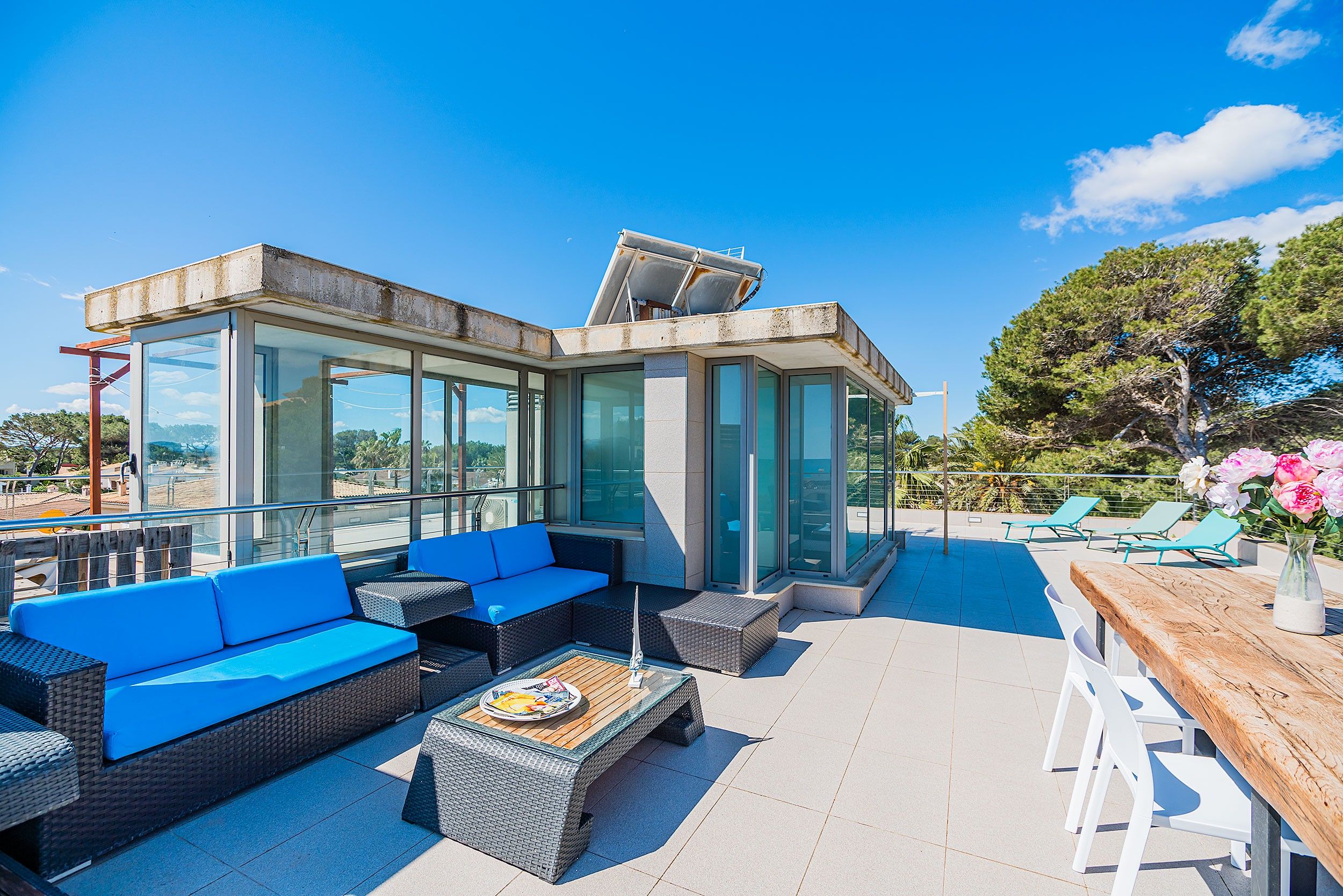 Detta moderna parhus ligger bara några meter från en av Mallorcas bästa stränder, som är känd för sin fina sand och lugna vatten. Fastigheten erbjuder vacker utsikt och ligger nära bekvämligheter som restauranger, barer, ett hälsocenter och en busshållplats, allt inom gångavstånd. Villan har en privat pool som kan inhägnas för små barns säkerhet, samt en gräsmatta på baksidan där barnen kan leka. Villan erbjuder moderna möbler och högkvalitativa beslag. På bottenvåningen finns ett rymligt vardagsrum med stora fönster som ger direkt tillgång till terrassen som har en sommarmatplats och utsikt över poolen. Det moderna köket är fullt utrustat med en central ö och ett extra bord, vilket gör det funktionellt och inbjudande. Det finns också ett badrum med dusch på denna våning. På övervåningen ligger sovrummen, alla med luftkonditionering. Det första sovrummet har en dubbelsäng, det andra har två enkelsängar. Båda delar på ett badrum med badkar och dusch. Det imponerande stora sovrummet är ett lyxigt utrymme med dubbelsäng, ett badrum med öppen planlösning och ett spektakulärt runt massagebadkar, dusch och toalett. Detta sovrum har också en privat terrass med havsutsikt. Villan erbjuder också en magnifik takterrass med soffor, solstolar, matbord och gasolgrill. Från terrassen har man en fantastisk panoramautsikt, vilket gör den till en idealisk plats för att koppla av och njuta av omgivningarna. Med alla dessa funktioner erbjuder denna villa en exklusiv och bekväm tillflyktsort, perfekt för dem som vill njuta av lugnet och skönheten på Mallorca nära havet. NRA: ETV/13421. VUD: ESFCTU000007011000854015000000000000000000000000000ETV/134211Faciliteter